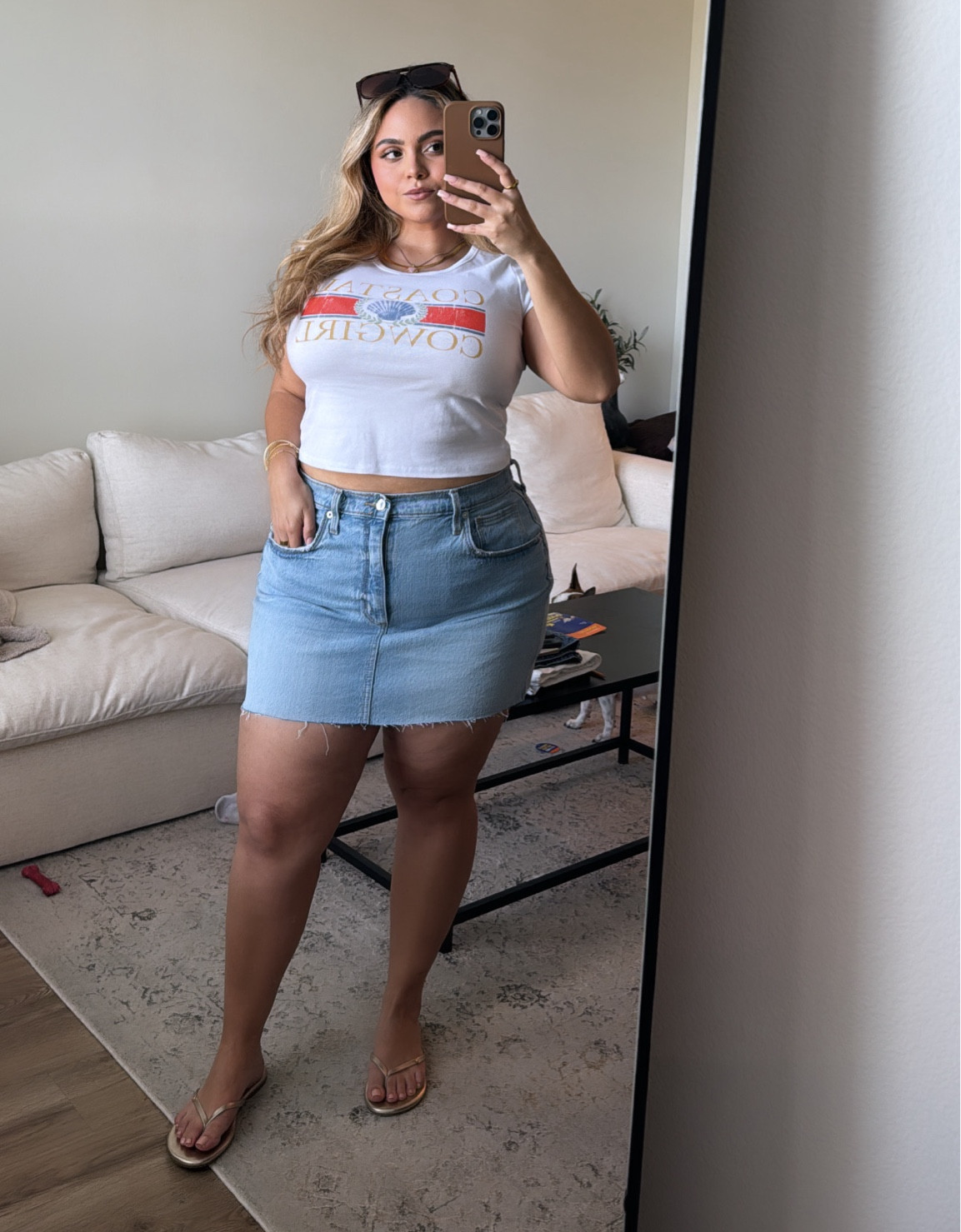 The combination of a classic white graphic tee and a timeless denim skirt creates a casual yet stylish look that’s perfect for a laid-back summer day. This outfit offers a flattering silhouette while providing comfort, making it a versatile choice for various occasions.