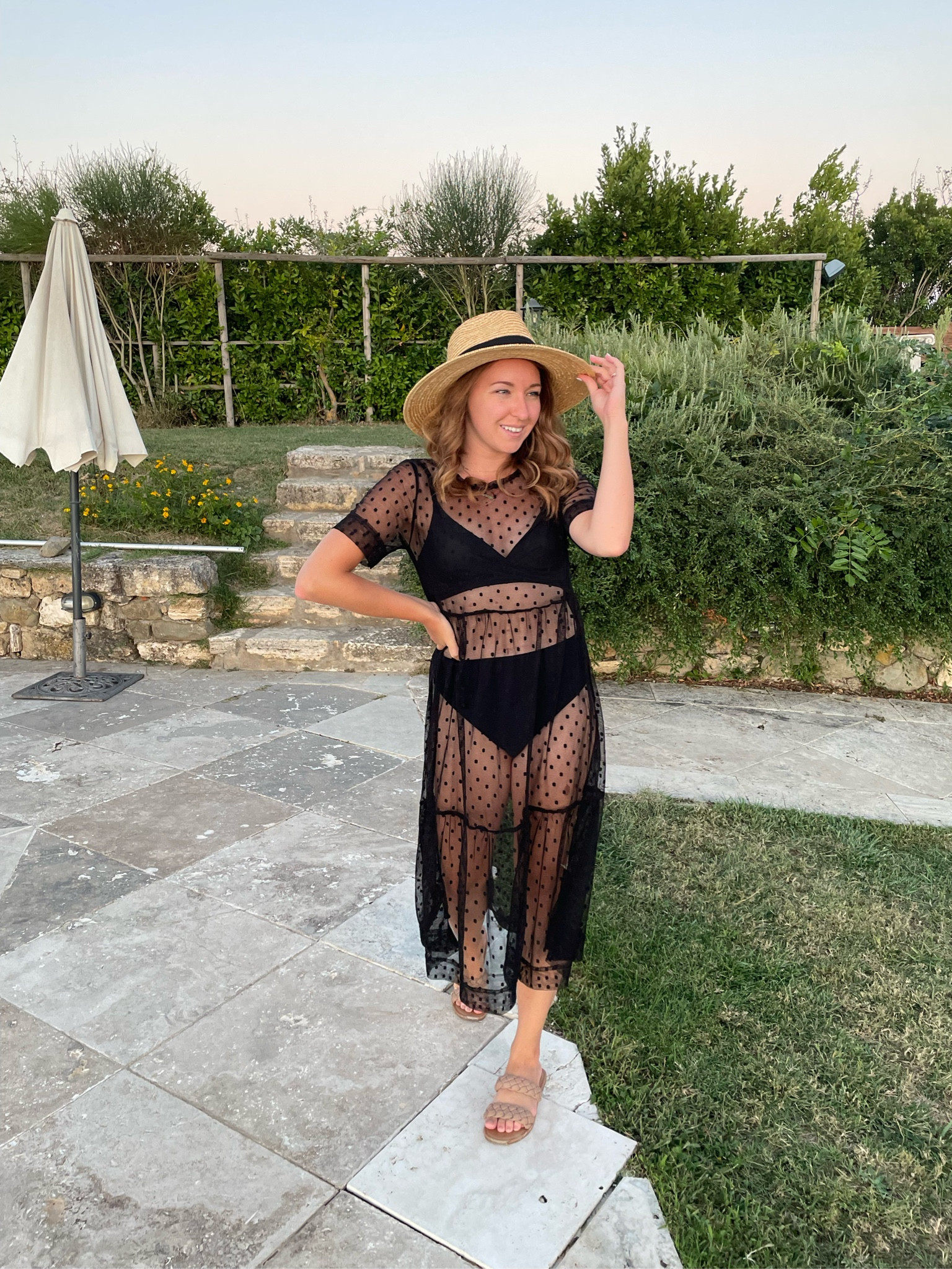 The sheer overlay of this ensemble exudes a playful yet elegant charm, allowing for a hint of skin while maintaining sophistication. Paired with a wide-brimmed hat, it strikes a perfect balance between casual chic and resort-ready sophistication.