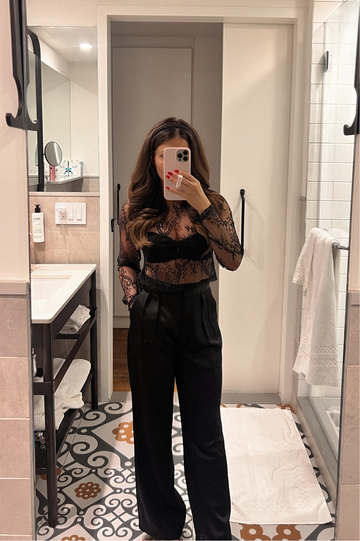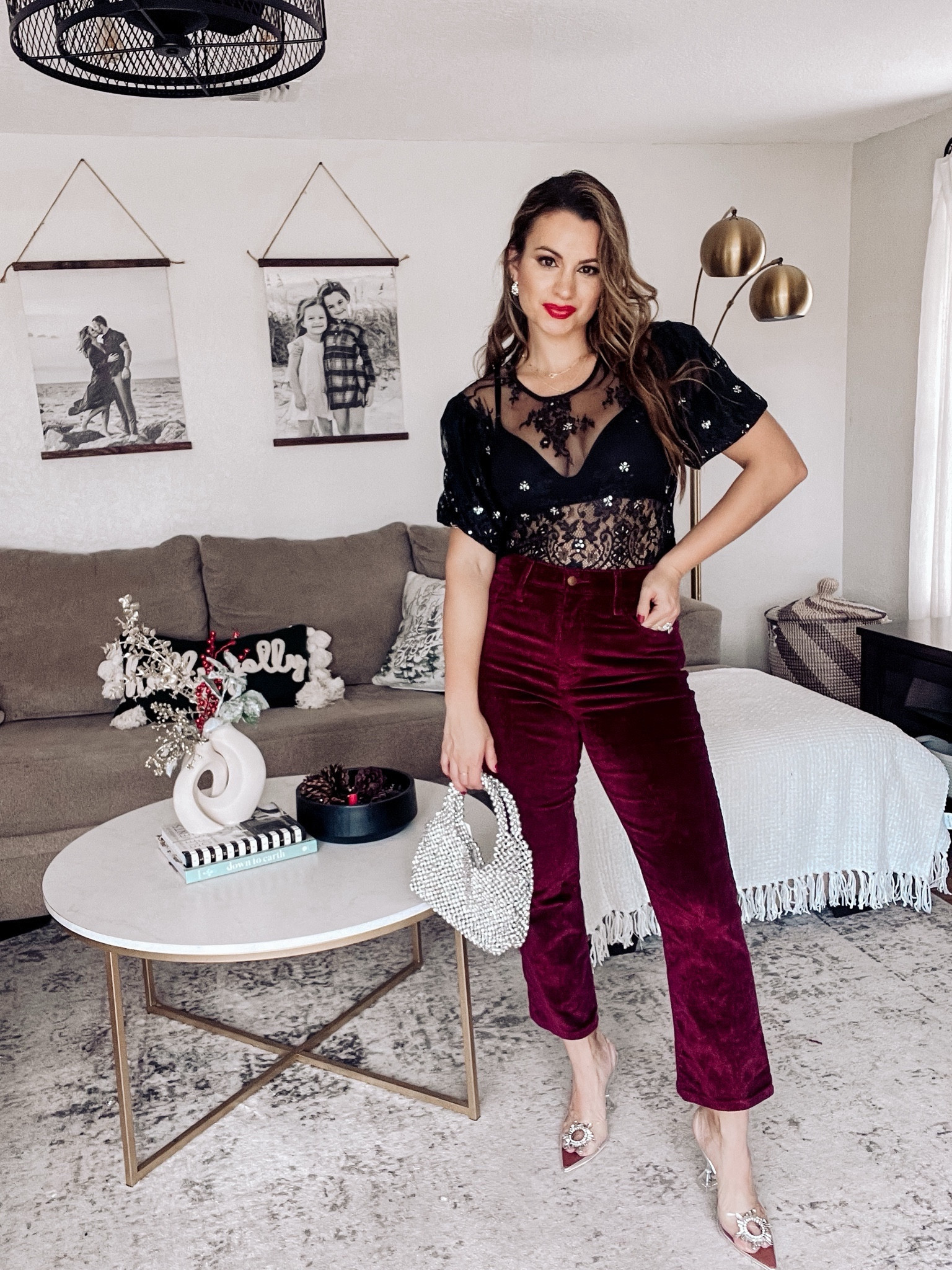 The outfit stunningly combines textures with a sheer lace top and luxurious velvet pants, creating a chic and sophisticated look. The addition of the pearl-studded bag and strappy heels adds a touch of glamour, perfect for a polished evening ensemble.