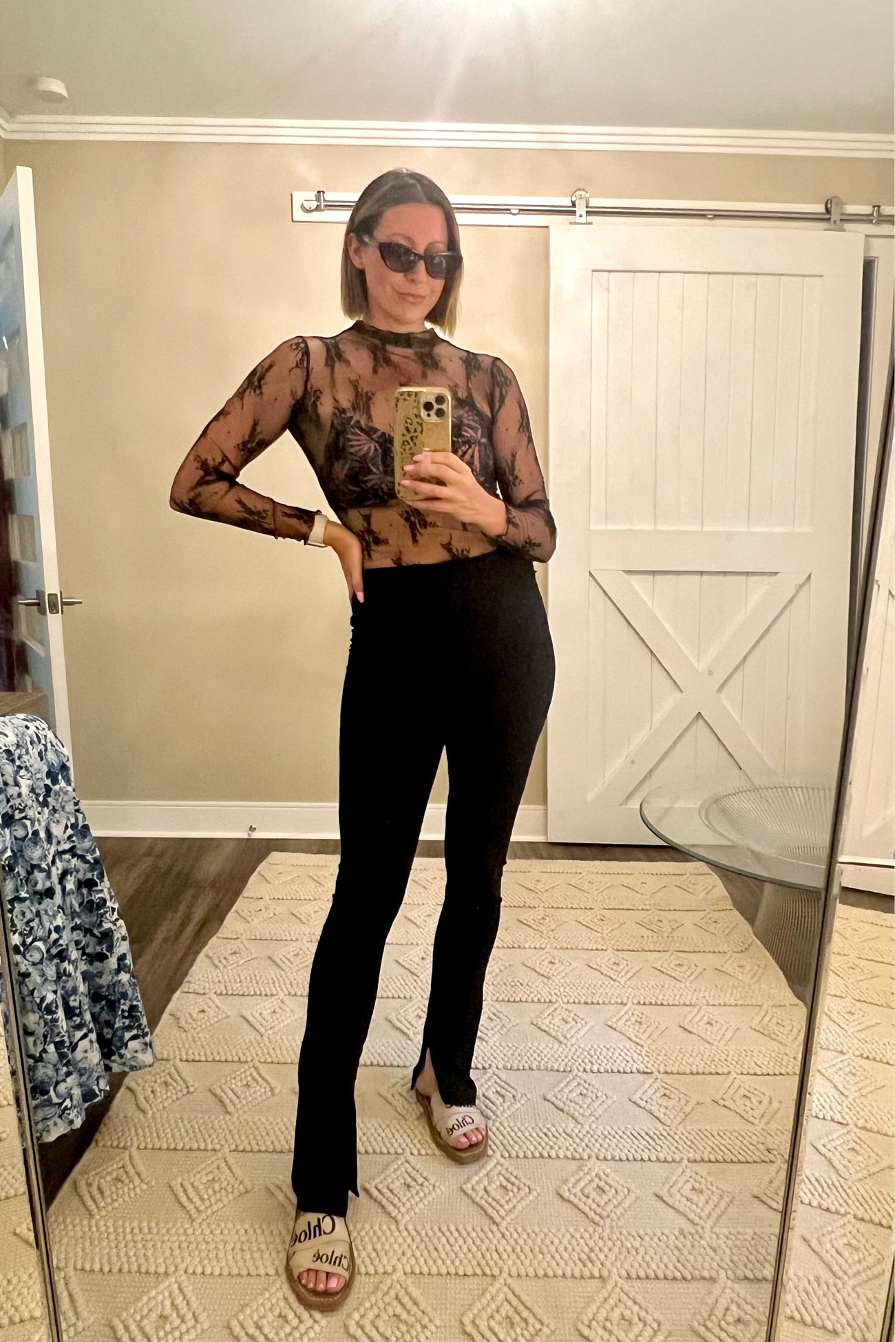 The sheer lace top adds a touch of elegant femininity and pairs beautifully with the classic high-waisted black pants, creating a sophisticated silhouette. The outfit is complemented by stylish sunglasses and open-toe heels, which add a chic, modern edge.