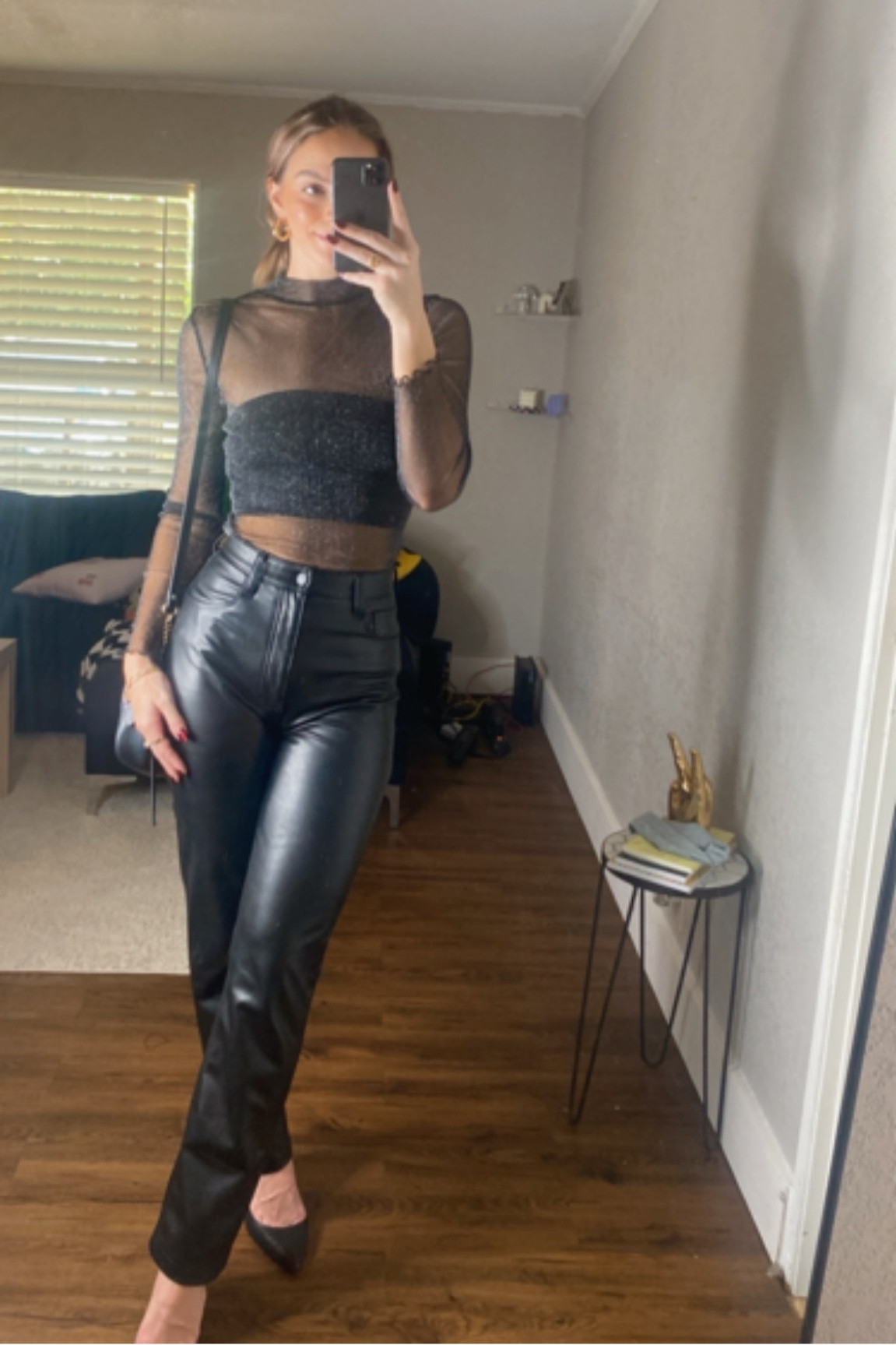 The sheer top paired with high-waisted leather pants delivers an edgy yet chic look, beautifully playing with textures. The monochromatic palette is timeless and elegant, and the fitted silhouette accentuates the figure gracefully.