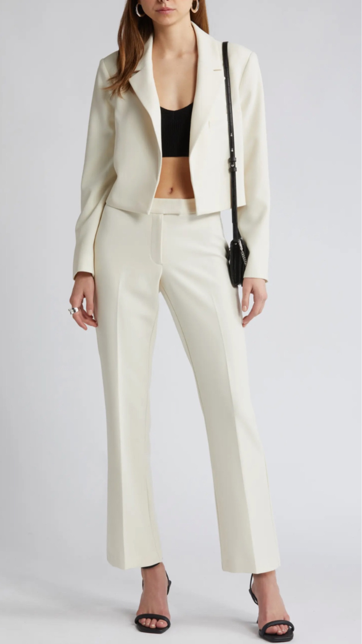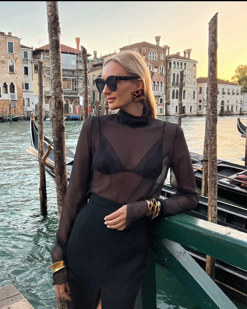 The sheer black top layered over a structured bralette exudes elegance while maintaining an edgy appeal, perfectly complemented by the high-waisted trousers that elongate the silhouette. The bold earrings and statement clutch add a playful yet sophisticated dimension to this chic monochromatic ensemble.