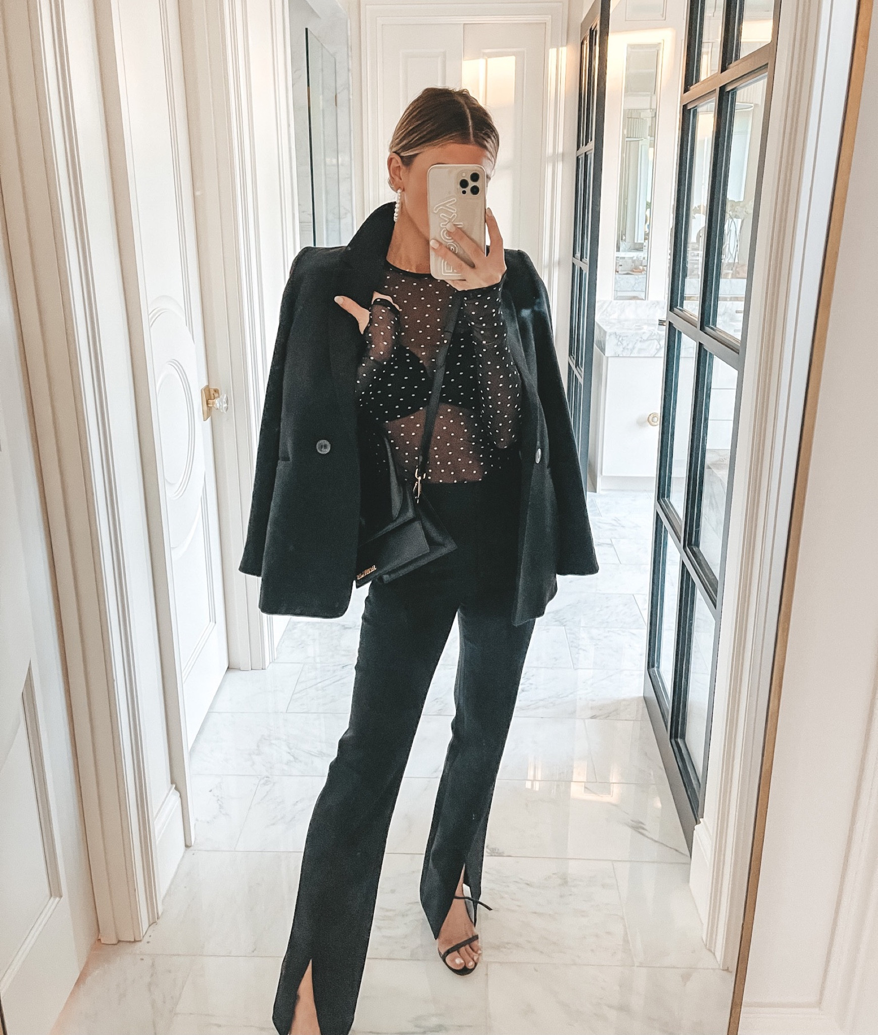 The combination of the tailored overcoat and high-waisted trousers exudes a chic, sophisticated silhouette, while the sheer dotted top adds a playful, yet elegant touch to the ensemble. The monochromatic palette ensures versatility, and the ensemble strikes a perfect balance between structured tailoring and delicate femininity.