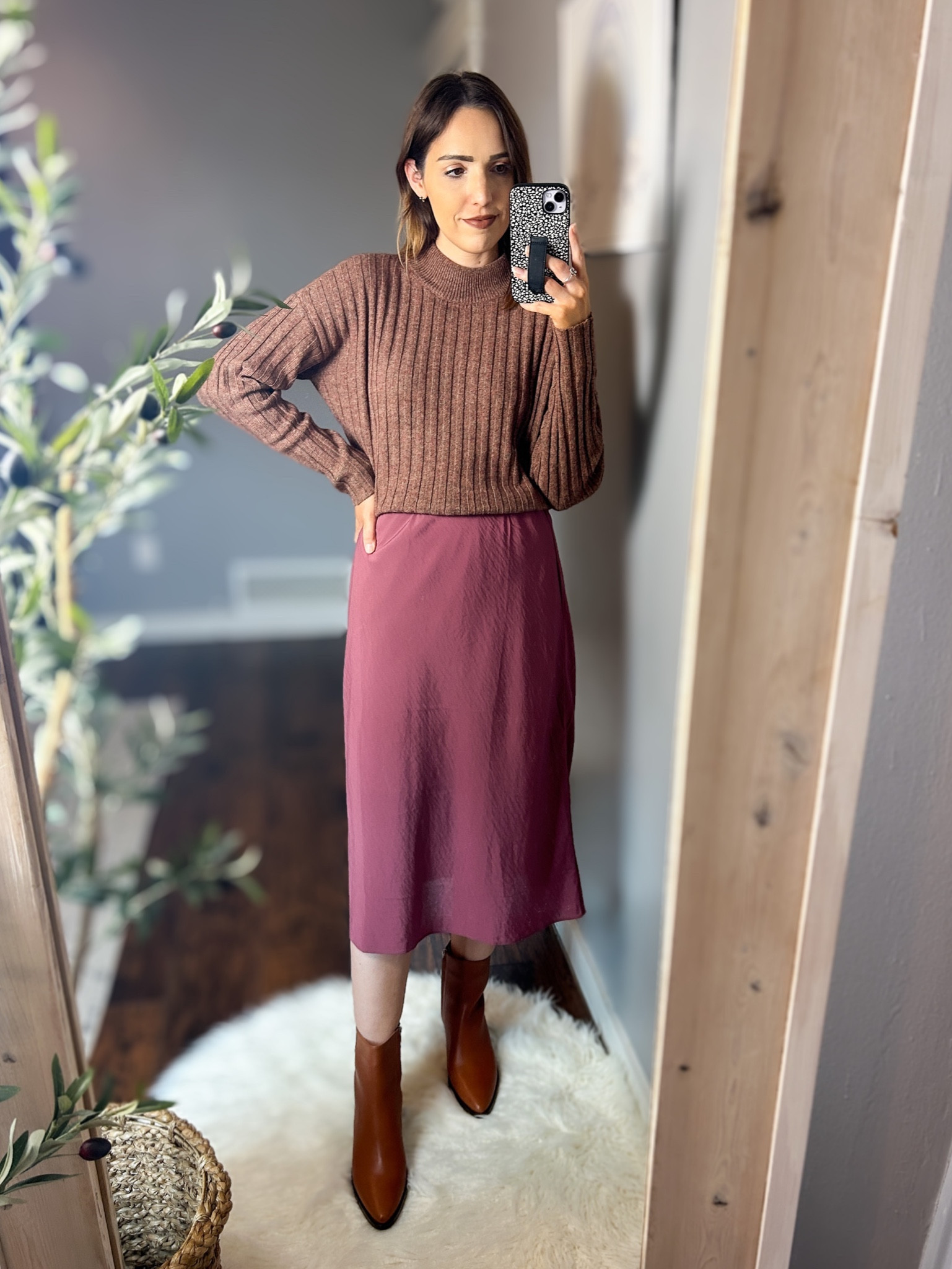 The warm tones of the sweater perfectly complement the muted pink of the skirt, creating a harmonious and seasonally versatile palette. The outfit balances comfort with a structured silhouette, offering a smart-casual appeal that’s both trendy and timeless.