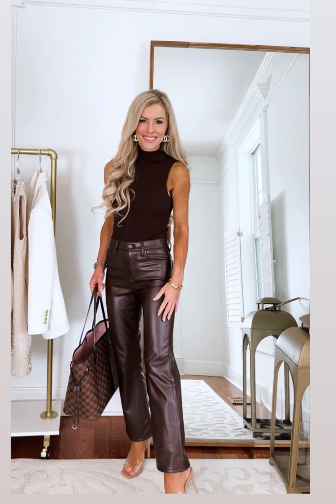 This ensemble is chic and sophisticated; the sleek, fitted mock turtleneck pairs beautifully with the high-waisted leather pants, creating a flattering silhouette. The combination of textures adds depth, and accessories like the classic handbag and pointed heels elevate the overall look with a touch of timeless elegance.