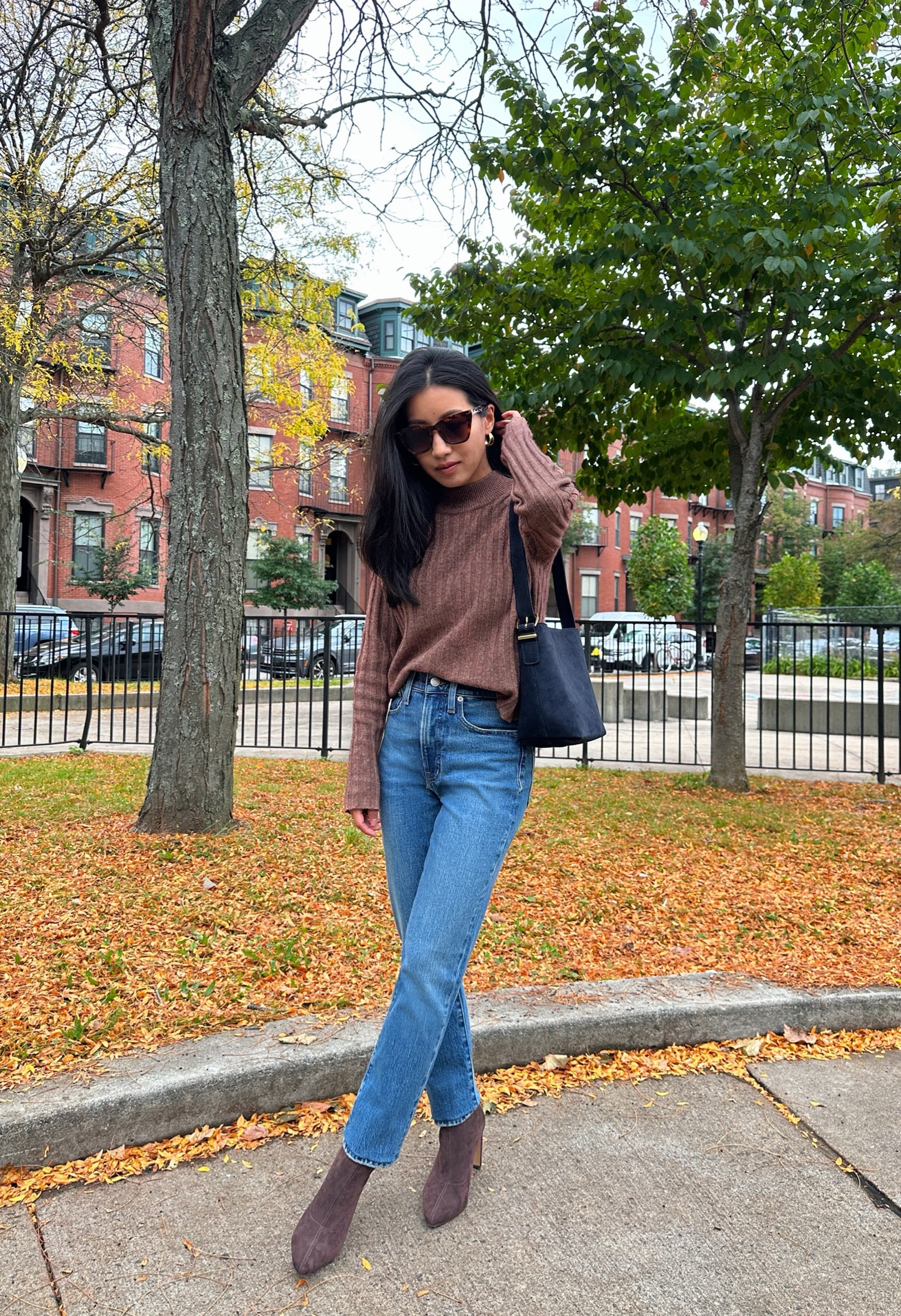 The rich, earth-toned sweater adds a cozy texture that contrasts beautifully with the classic cut of the well-fitting jeans, creating a balance between comfort and sophistication. The complementary hues of the ankle boots and top unite the ensemble, while the sunglasses add a touch of chic, understated glamour.