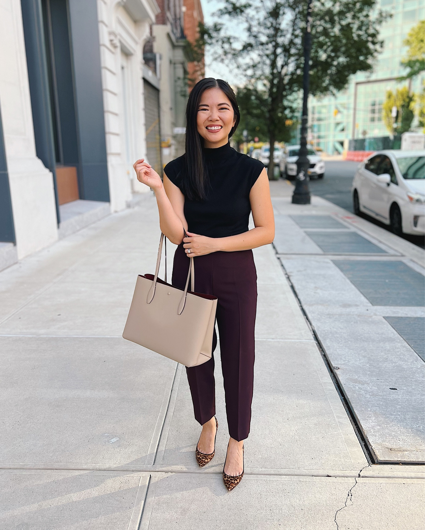 The ensemble exudes effortless elegance with its classic color combination and tailored fit, while the pointed leopard print shoes add a delightful pop of personality and trendiness to the chic, monochromatic base. The large tote adds both functionality and a tasteful complement to the color scheme, pulling the look together beautifully.