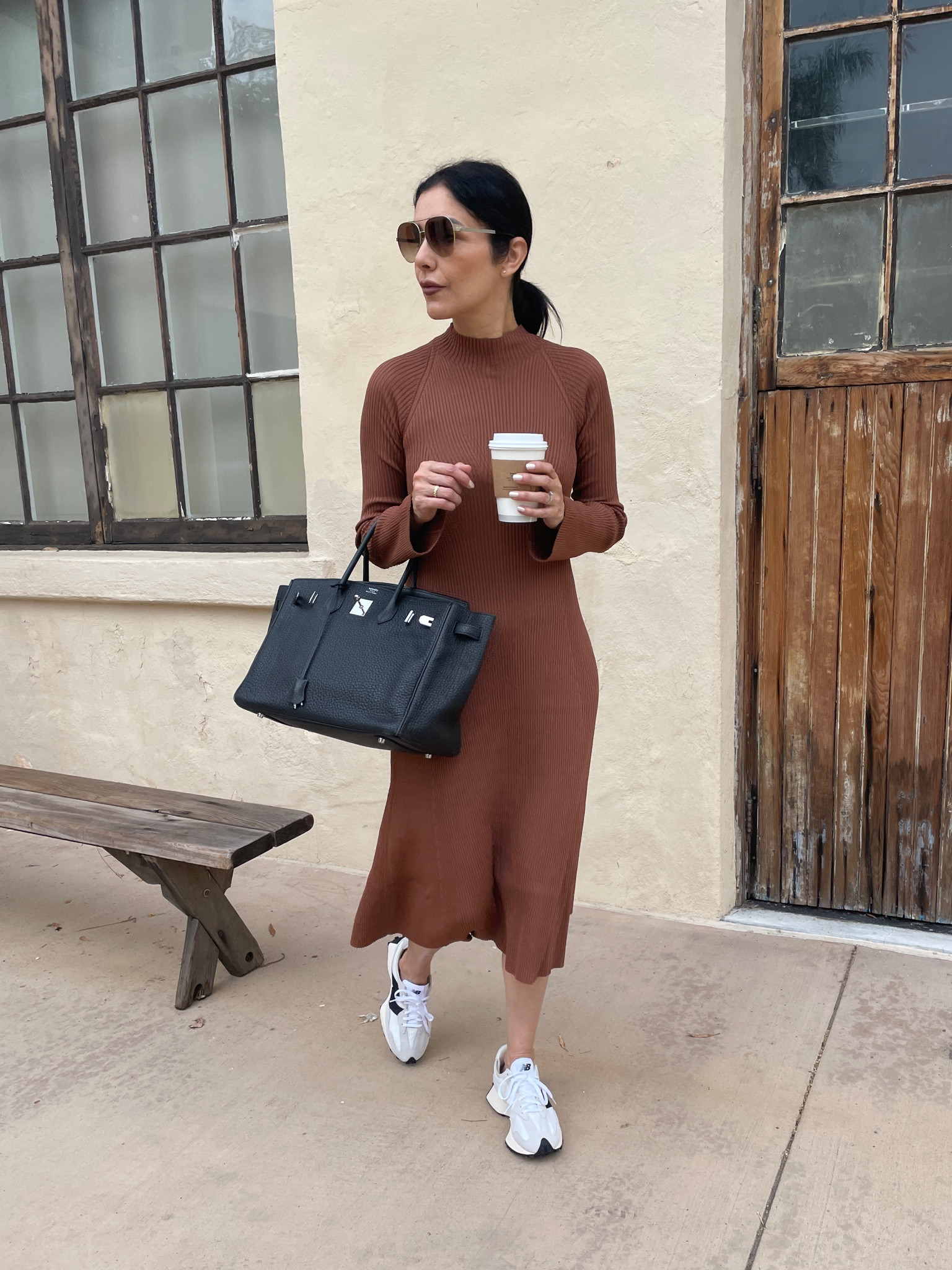 The monochromatic brown dress exudes sophistication with its form-fitting silhouette and subtle flares, while the classic white sneakers add a sporty yet chic touch that speaks to modern, everyday elegance. The addition of the structured black handbag brings a polished contrast, perfect for an upscale, versatile look.