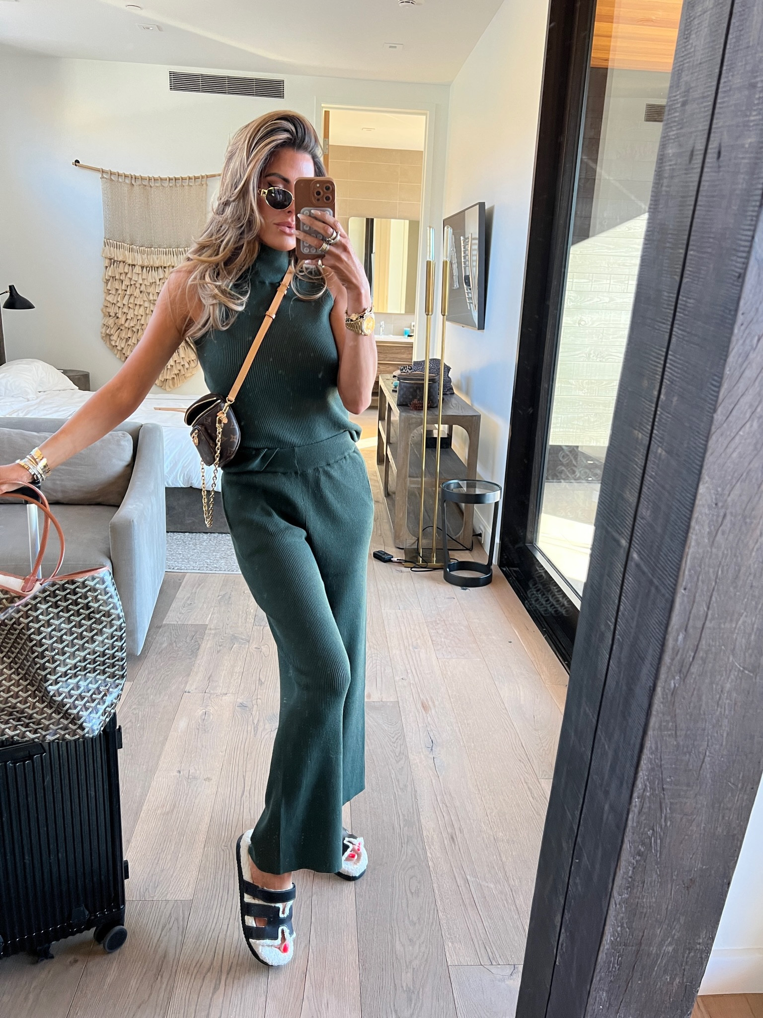 The monochrome green jumpsuit creates a sleek, continuous line, exuding sophistication, while the choice of accessories adds just the right touch of contrast and personality. The ensemble strikes a balance between casual chic and polished elegance, perfect for a modern, fashion-forward look.