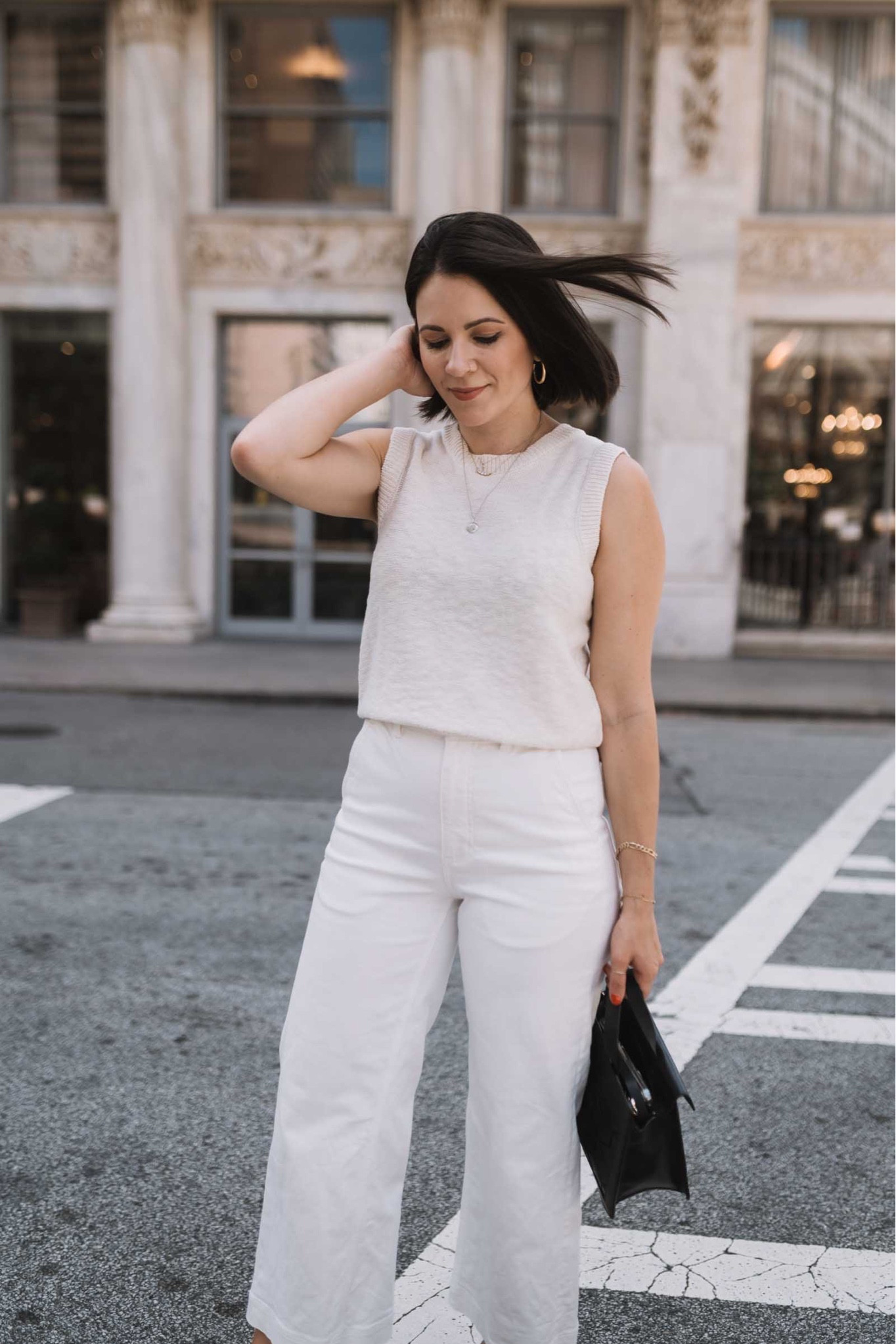 The monochromatic palette exudes a timeless elegance, with the high-waisted white trousers elongating the silhouette. The sleek black top adds a modern touch, complemented by minimal accessories for a chic, polished look.
