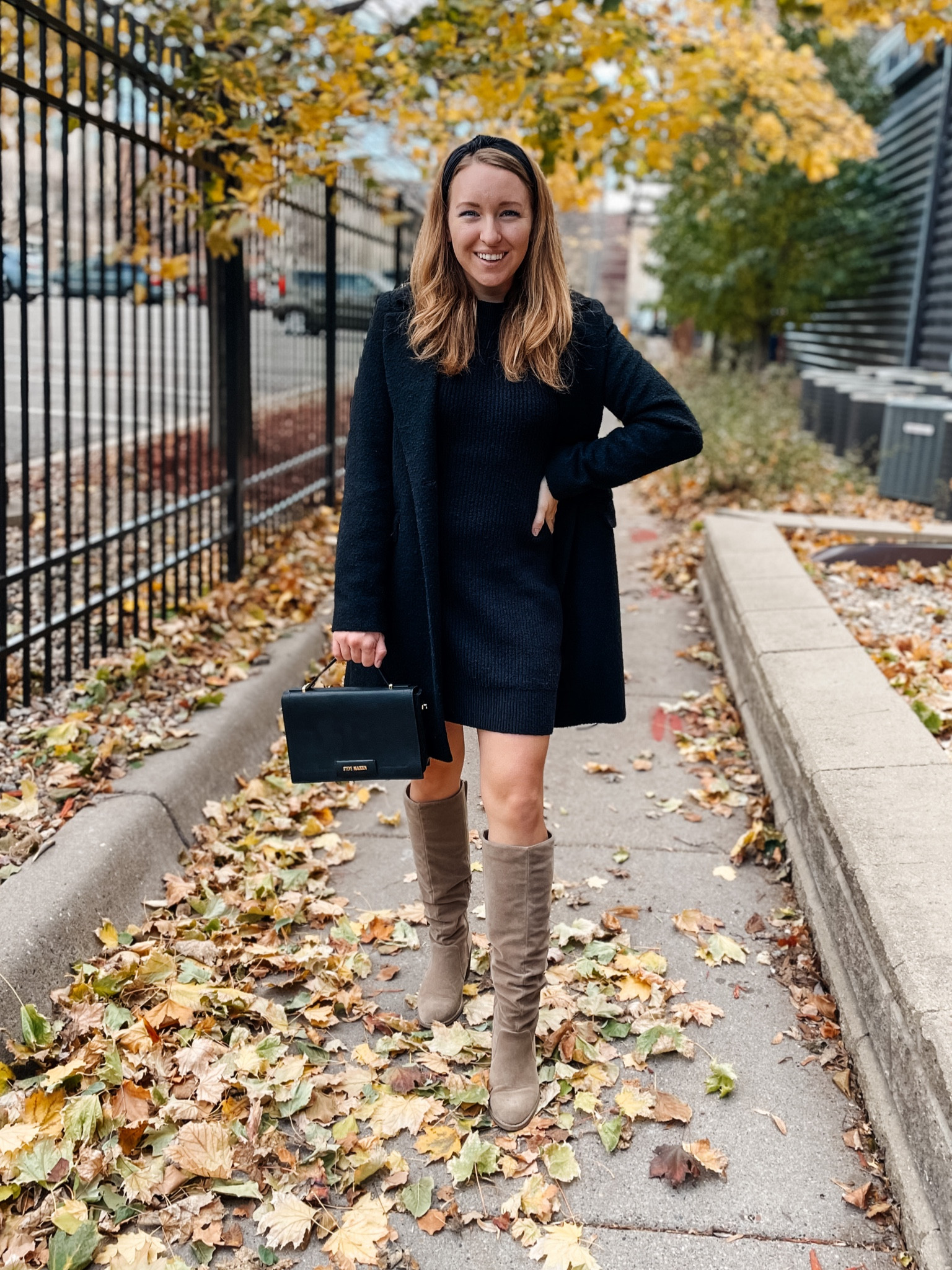 The structured silhouette of the navy tunic dress paired with taupe over-the-knee boots creates a chic and balanced autumn look, enhanced by the timeless elegance of the black handbag. The ensemble exudes effortless sophistication, perfect for crisp seasonal outings.