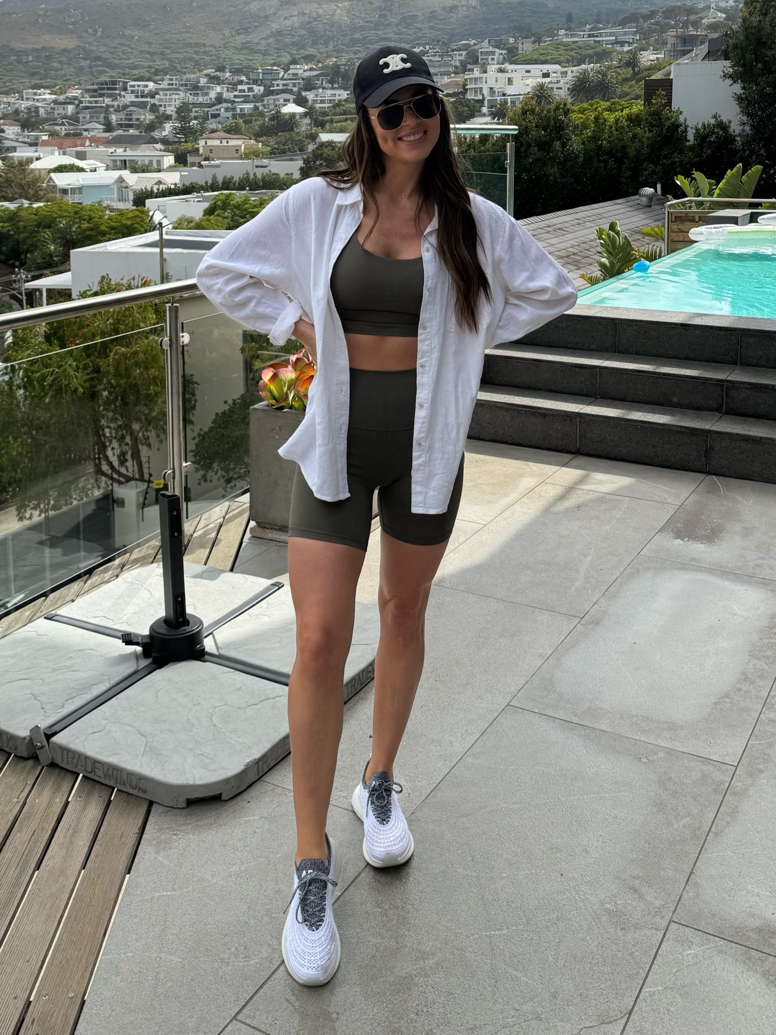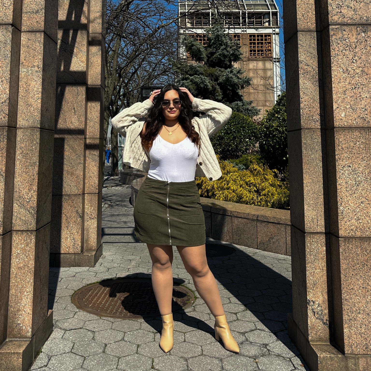 The ensemble offers a balanced blend of relaxed and refined with a crisp white top providing a versatile base, paired with a structured olive skirt that accentuates the silhouette. Complementing accessories, like the stylish sunglasses and matching footwear, pull the look together for an effortlessly chic, day-out vibe.