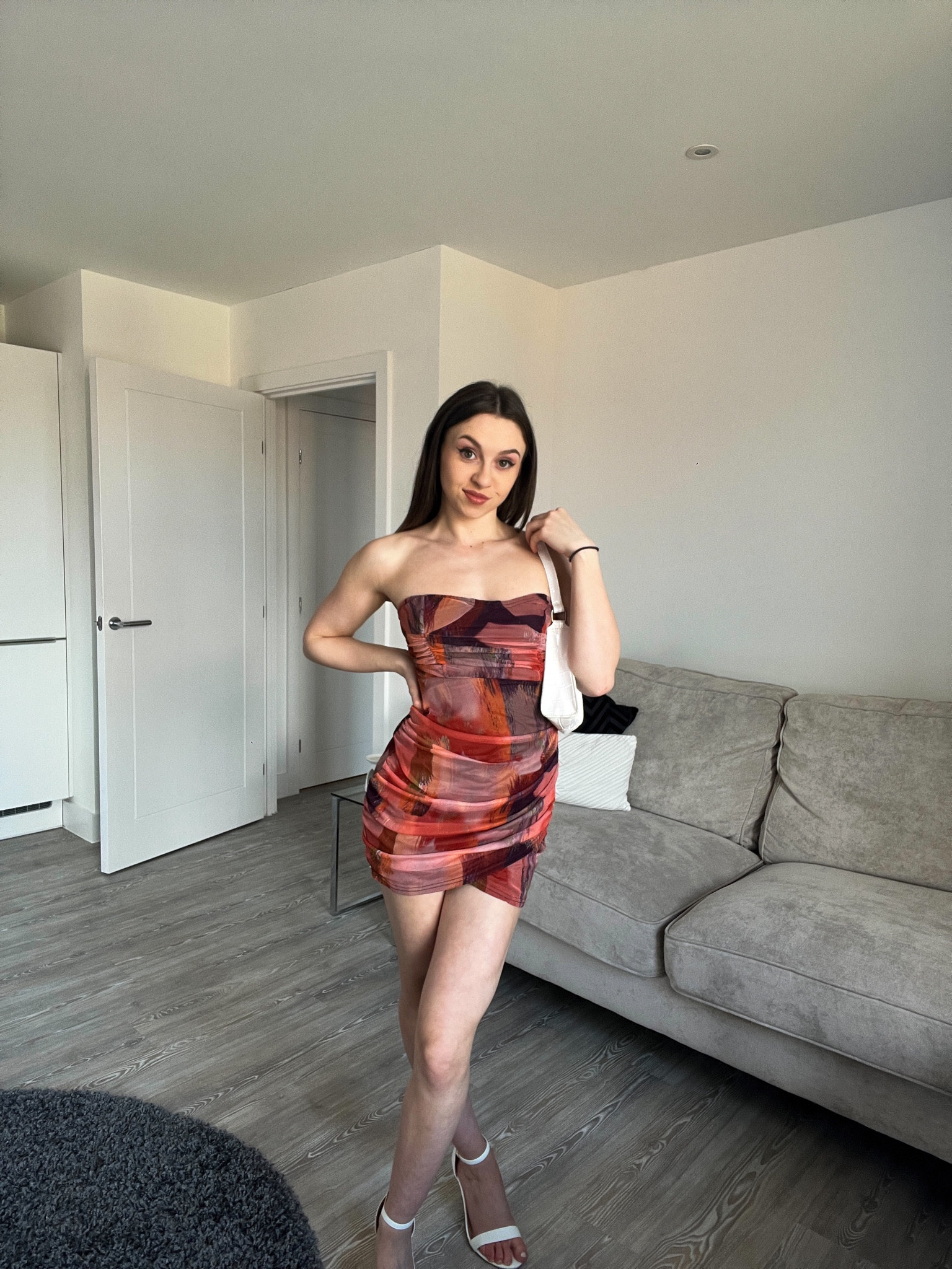 This ensemble features a vibrant, eye-catching print that adds a playful and energetic feel to the outfit. The sleek silhouette of the dress paired with the strappy heels creates a harmonious balance, emphasizing a chic and modern style.
