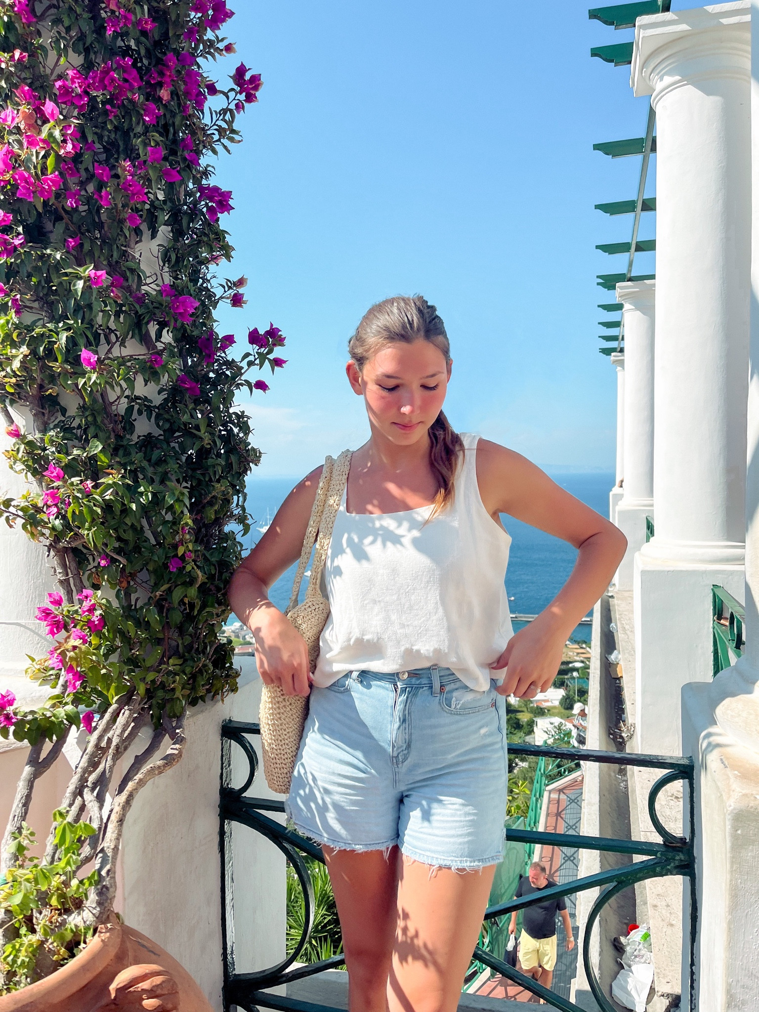 The outfit is effortlessly chic with a lightweight, breezy white top that complements the casual summer vibe of the denim shorts. The ensemble is perfectly suited for a warm, picturesque outdoor setting, balancing comfort and style.