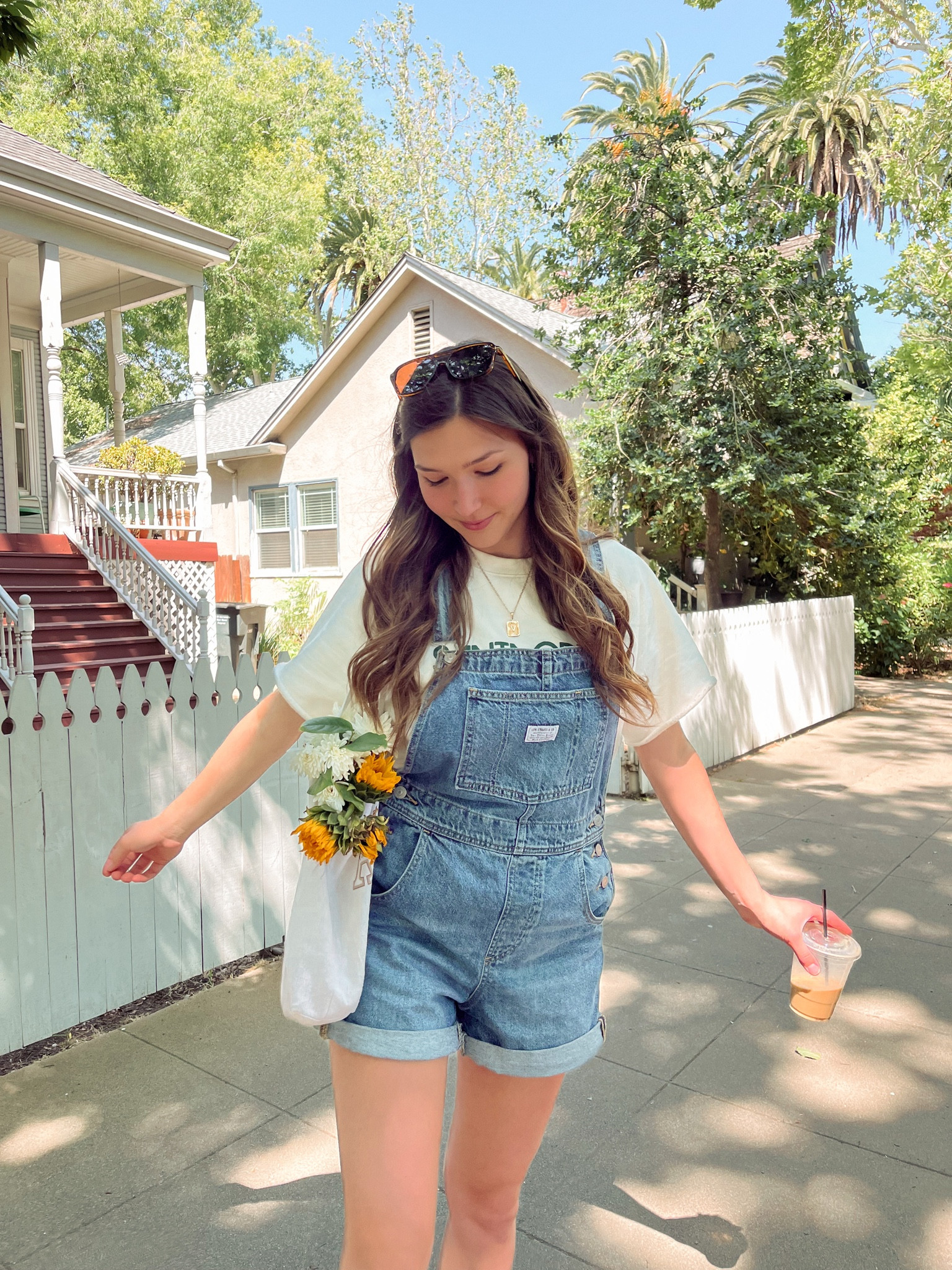 The outfit strikes a charming balance of casual and cute with its timeless denim overalls paired with a simple white shirt, creating a comfortable yet styled look. The accessory choice of a hair clip adds a playful touch, while the sunflowers bring a pop of color, enhancing the overall sunny, laid-back vibe.