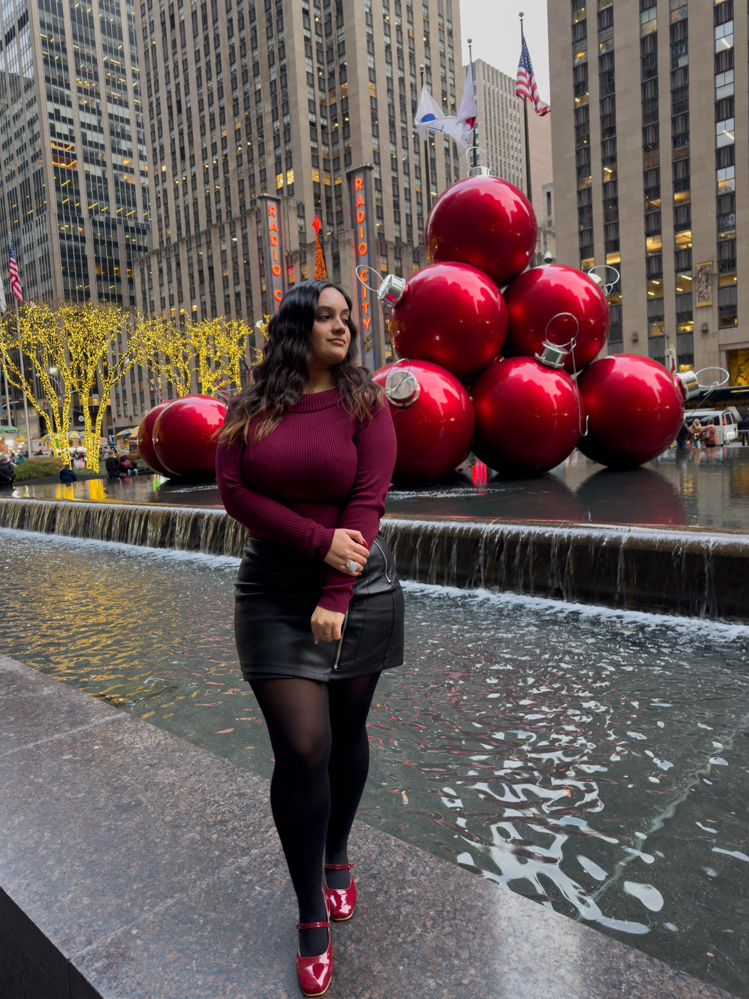The outfit features a well-coordinated color scheme, with the deep red of the top complementing the glossy black of the skirt and tights, creating a chic and cohesive look. The metallic sheen of the shoes adds a pop of festive brightness, tying in well with the urban holiday setting for an overall stylish ensemble.