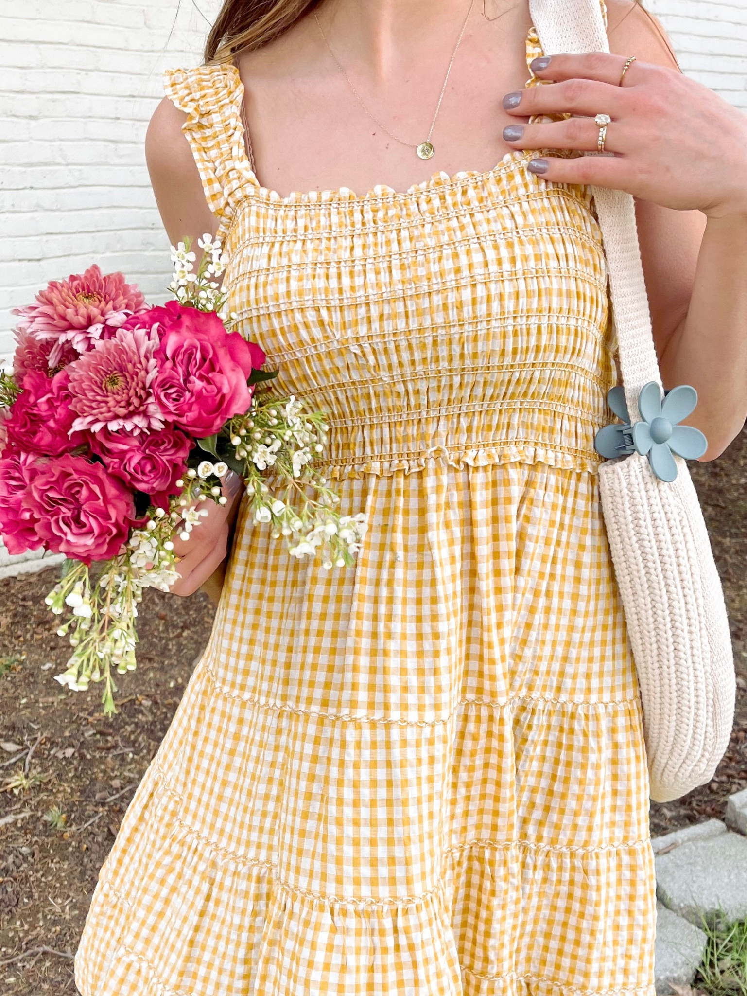 The yellow gingham dress exudes a charming and cheerful vibe, perfect for a sunny day, with its ruffled straps and smock detailing adding a touch of playful femininity. The outfit is nicely accessorized with a simple necklace that complements the dress without overwhelming it, and the bouquet adds a splash of color that ties the whole summer look together.