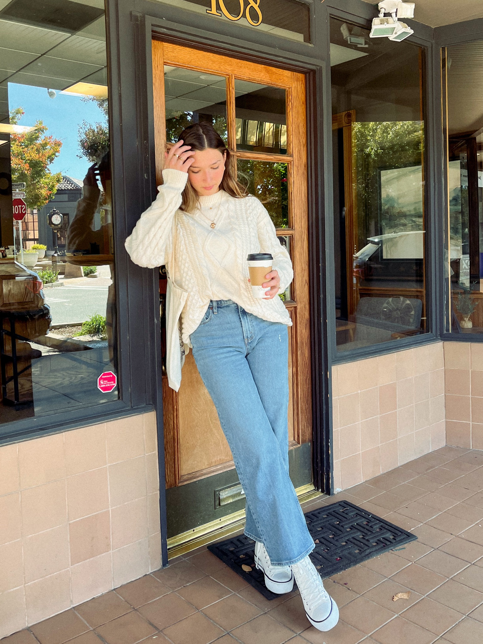 This outfit showcases a classic and comfortable aesthetic with its well-fitted, high-waisted jeans and chunky knit sweater, providing a balance of texture and relaxed style. The choice of clean white sneakers adds a modern and casual touch, perfect for a effortlessly chic day out.