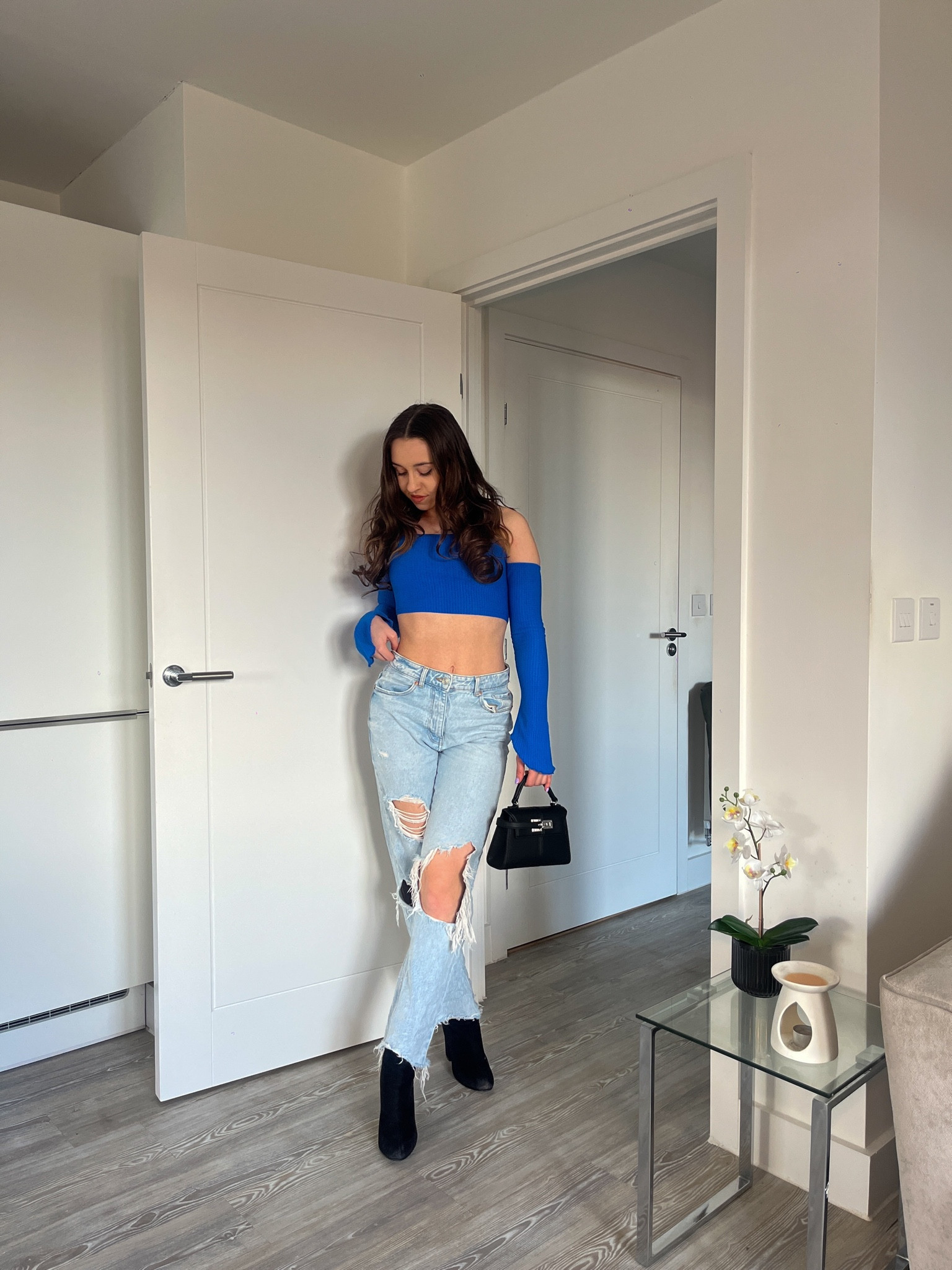 The bold blue crop top adds a vibrant pop of color that catches the eye, while the distressed jeans create a trendy, edgy contrast. The sleek black boots and handbag add a touch of sophistication, pulling the look together cohesively.