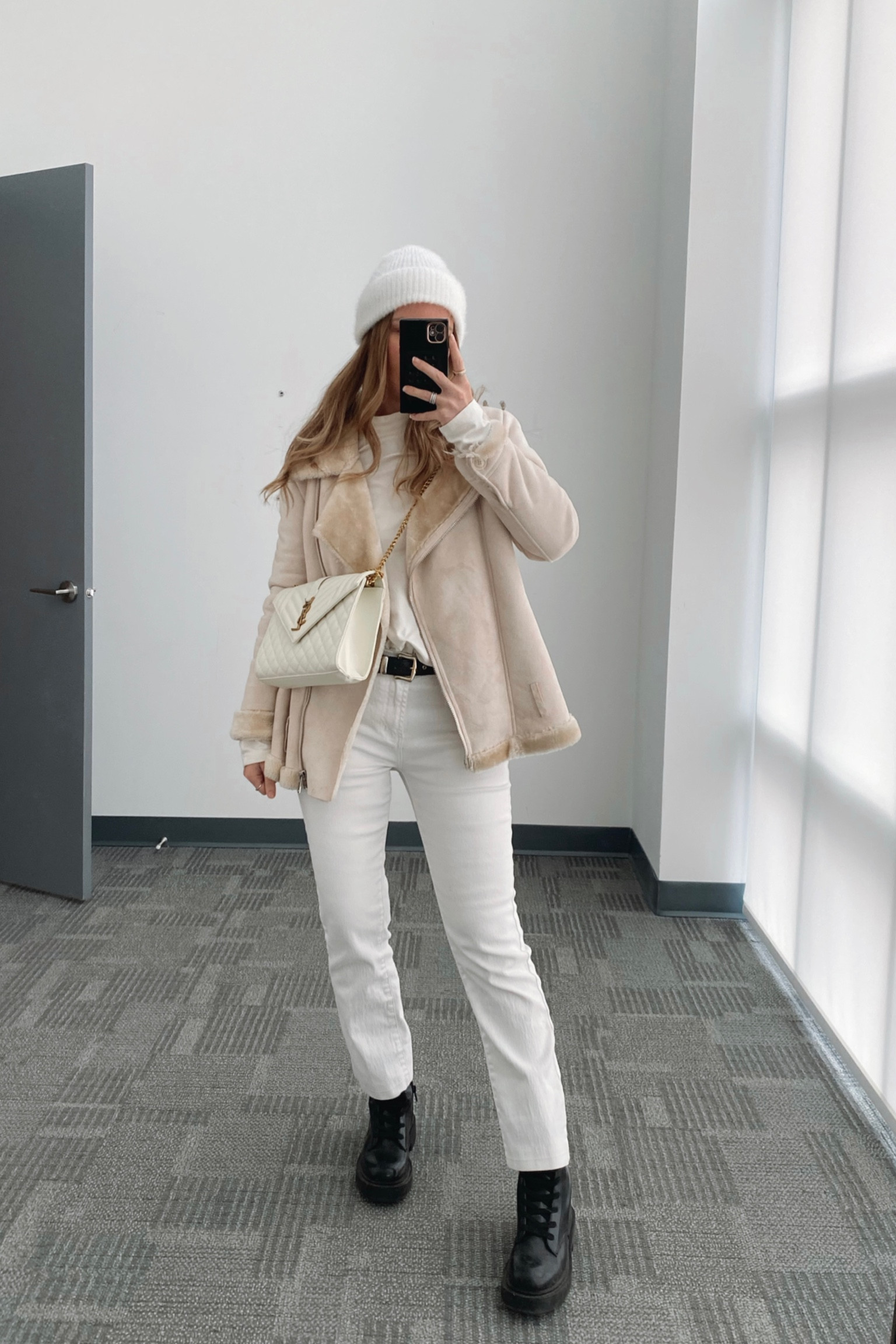 The outfit showcases a clean and modern edge with its monochromatic palette, while the textural contrast between the plush jacket and smooth pants adds a sophisticated touch. The sturdy black boots offer a grounding contrast, providing a stylish balance to the soft neutrals.