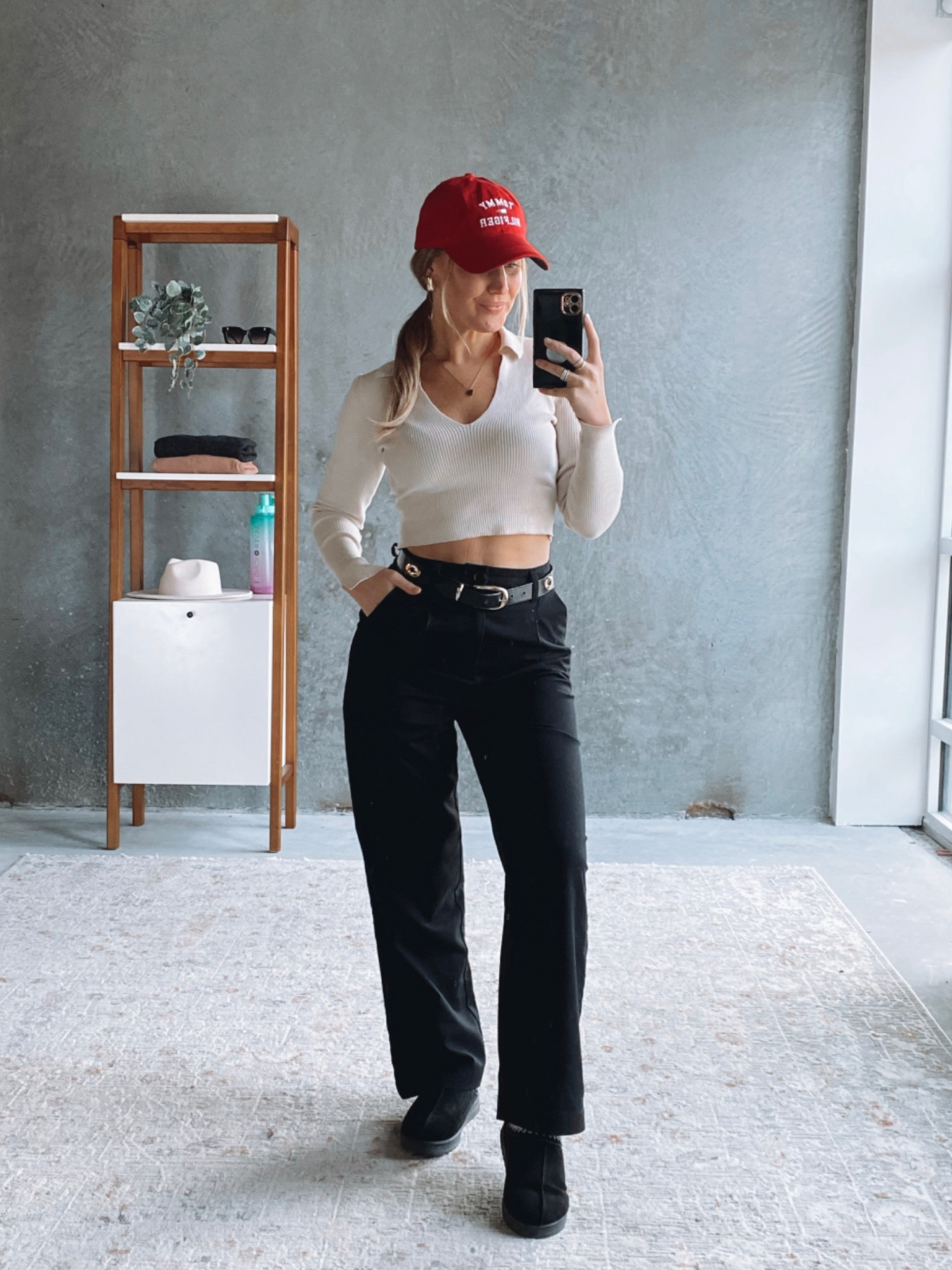 The outfit presents a chic, casual style with a contrasting color palette that balances the brightness of the top and hat with the darker tones of the pants and shoes. The cropped top adds a trendy touch, while the high-waisted pants create a flattering silhouette that elongates the legs.