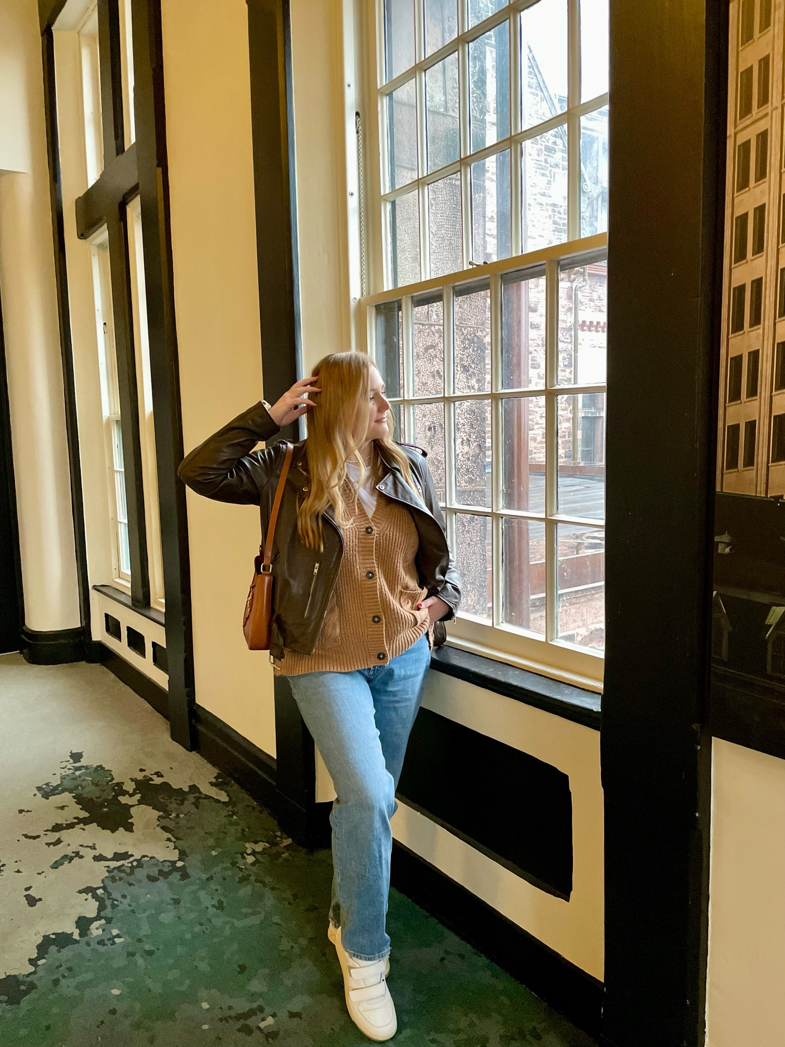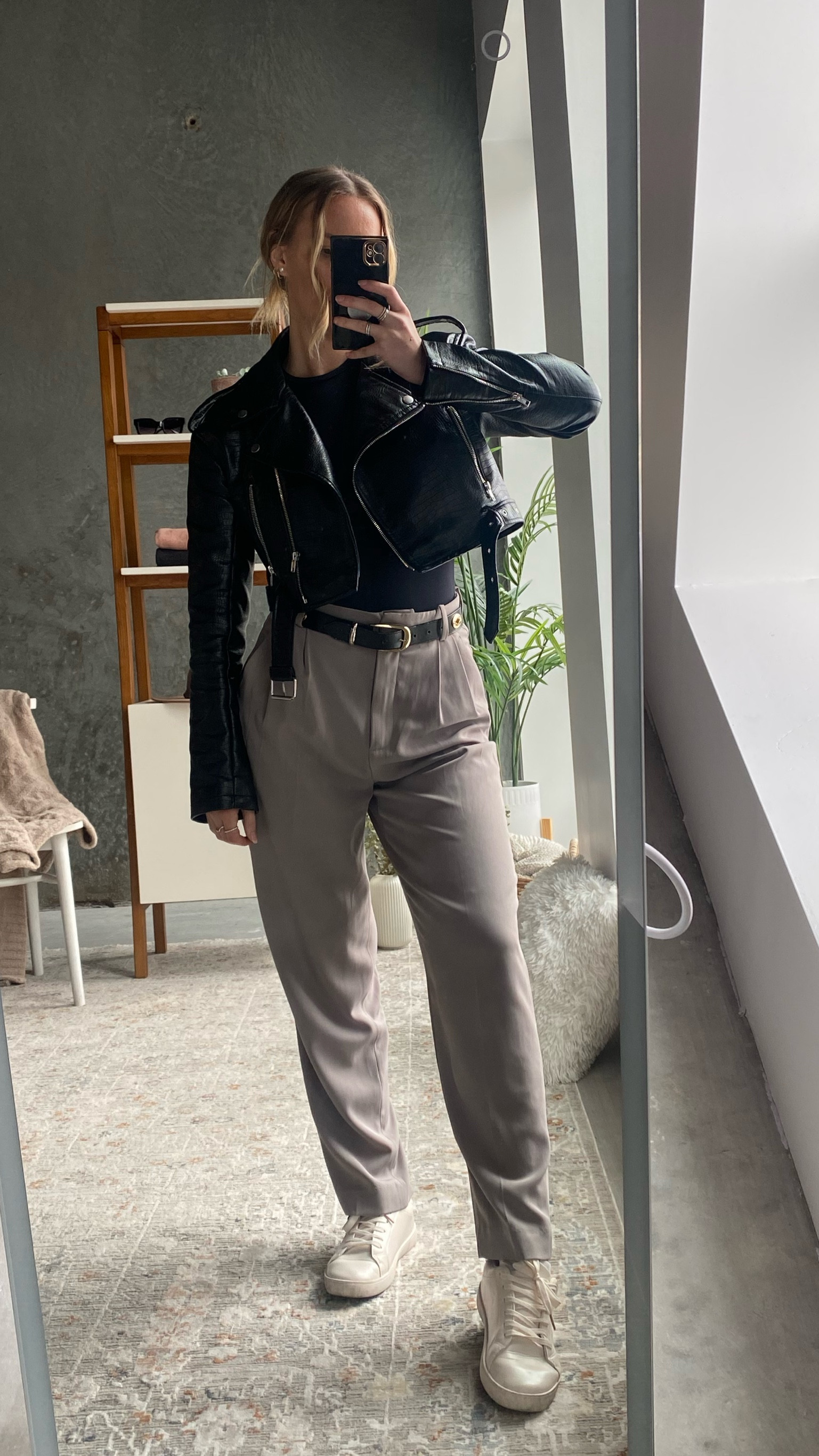 The classic black leather jacket adds a timeless, edgy touch to the ensemble, while the neutral-toned pants provide a smart contrast and create a streamlined, modern silhouette. The clean, white sneakers offer a casual yet polished finish, completing the look with a balance of style and comfort.