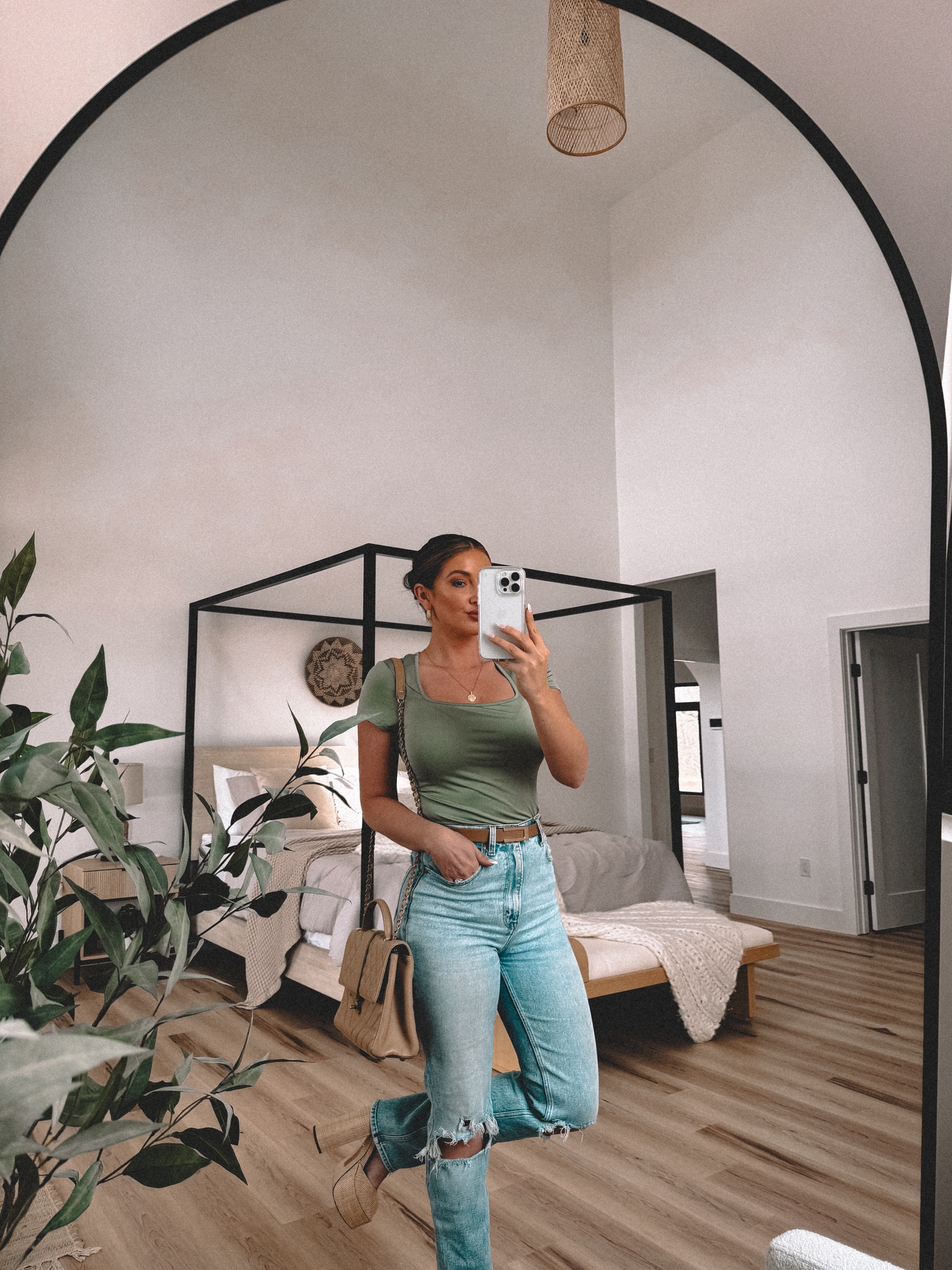 The outfit boasts a relaxed yet stylish ensemble, with the well-fitted olive green top complementing the casual aesthetic of the distressed jeans, creating an effortlessly chic look. The high-rise cut of the jeans along with the tucked-in top accentuates the waist, providing a flattering silhouette that is both modern and versatile.