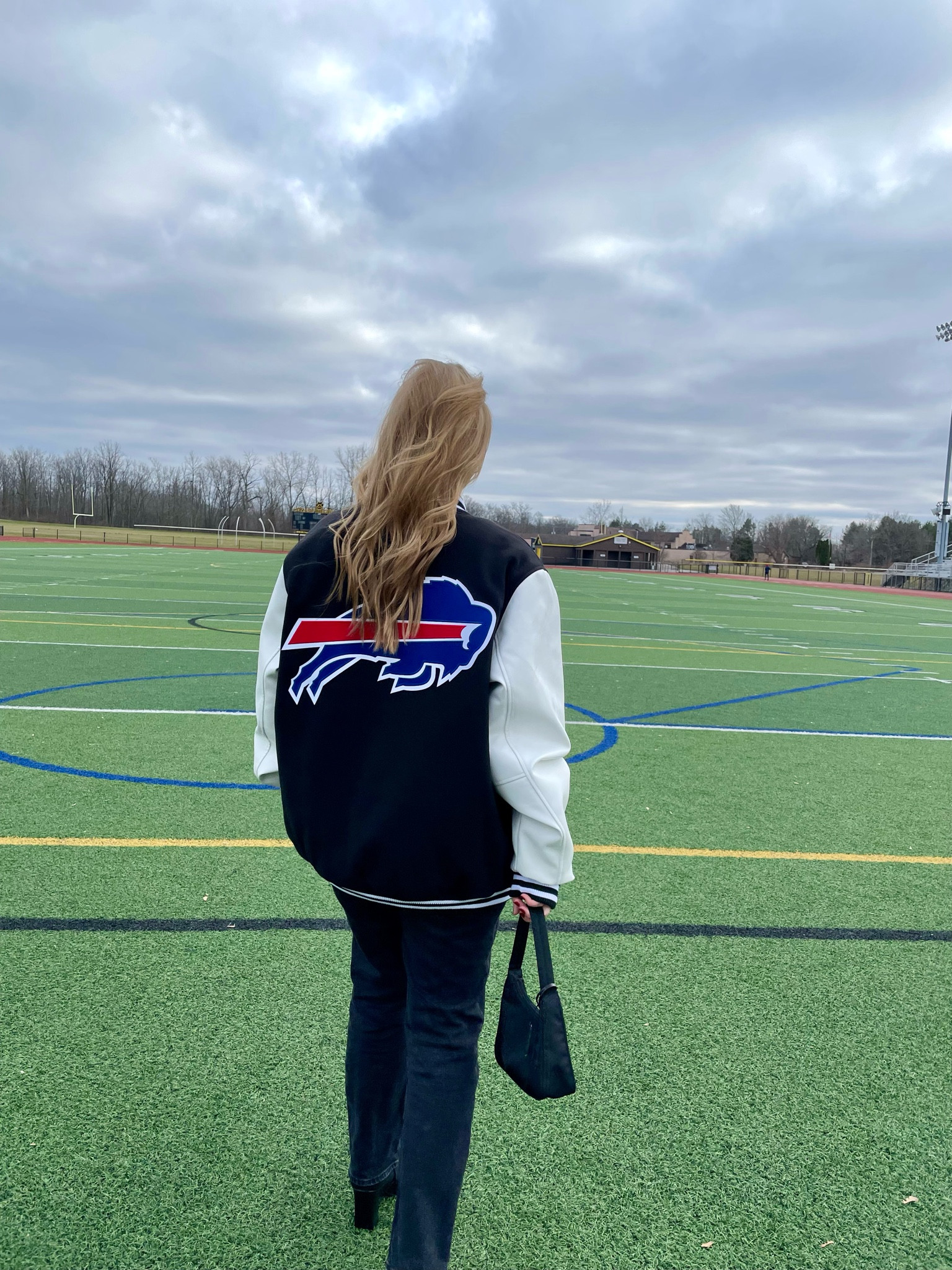 The oversized sports jacket creates a relaxed and trendy silhouette, emphasizing comfort and team spirit, while the dark pants and bag add a sleek contrast, keeping the look grounded and versatile.