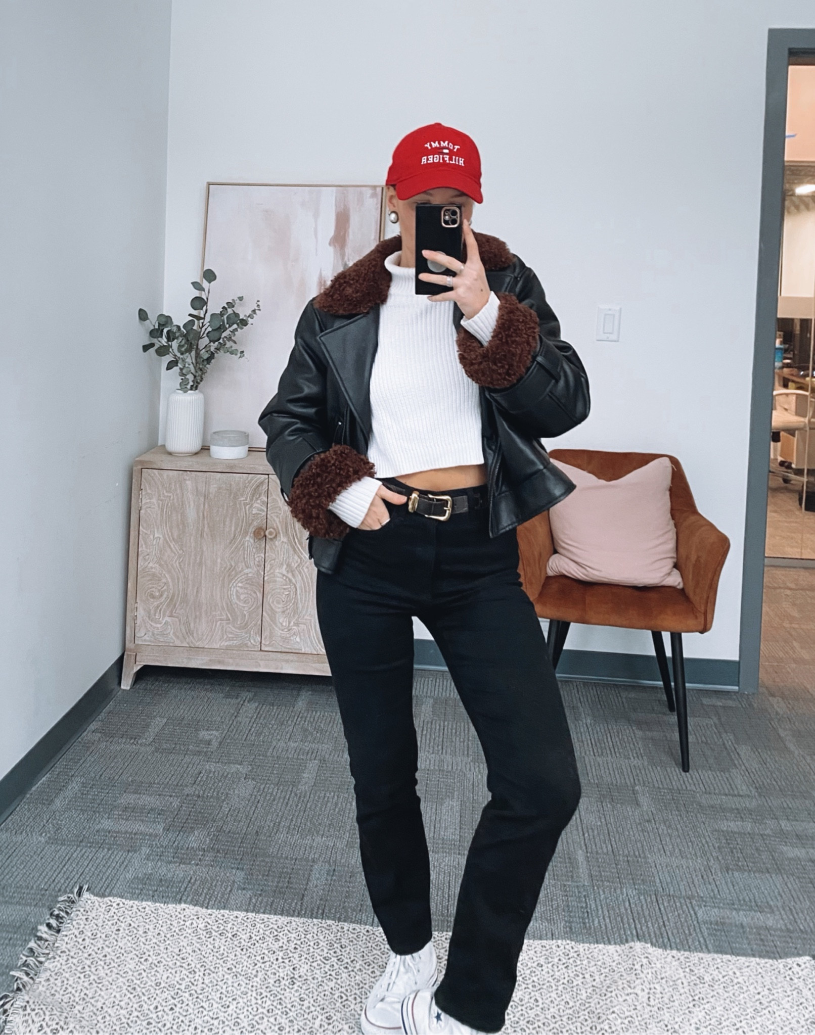 This outfit displays a trendy urban chic aesthetic with a balanced play on textures—combining a sleek leather jacket with a fur collar and classic black denim for a stylish, cohesive look. The bright red cap adds a pop of color that draws attention and completes the ensemble with a bold statement accessory.