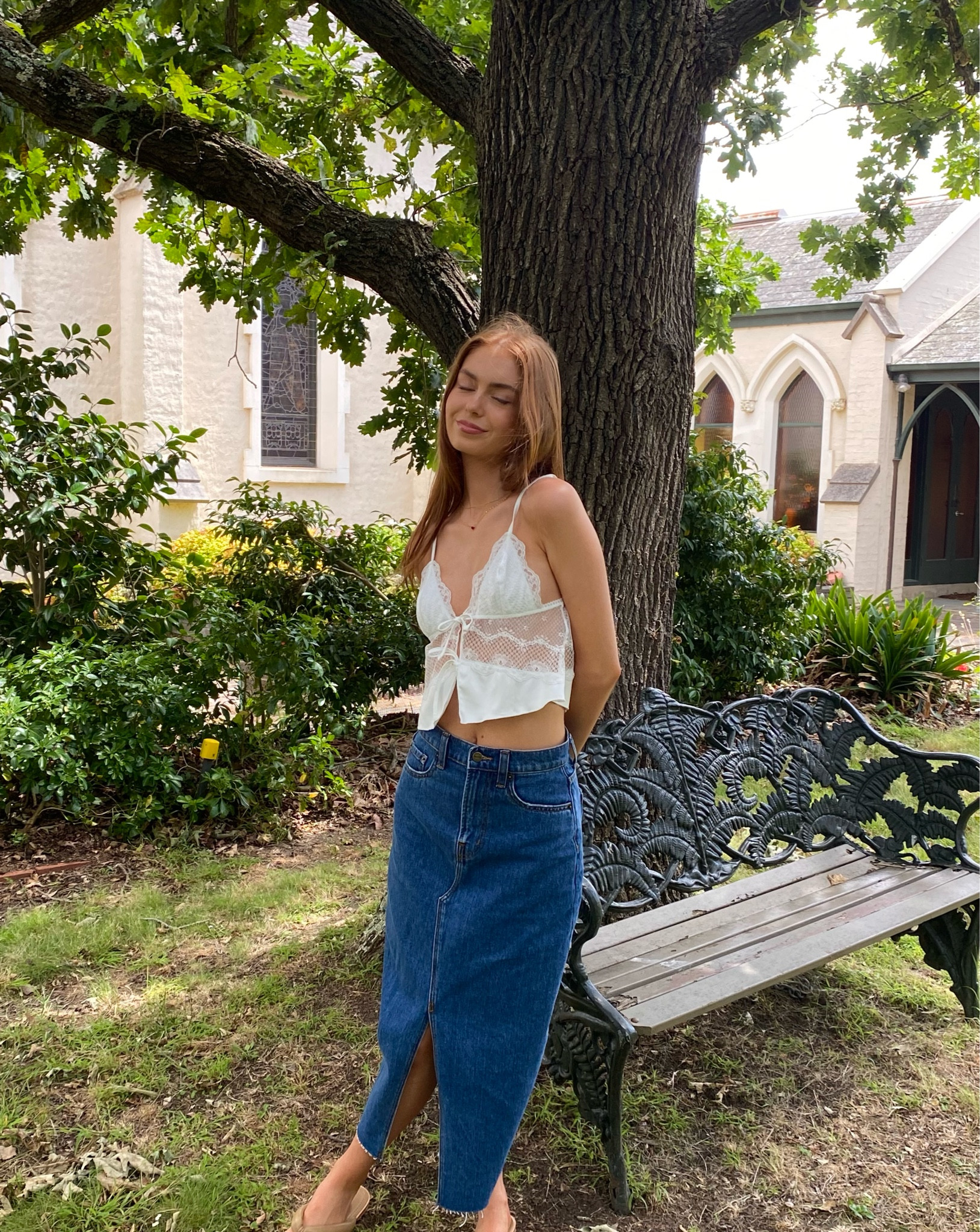 The outfit showcases a harmonious balance of textures, with the delicate lace top juxtaposed against the more rugged denim, creating an effortlessly chic and feminine look. The high-waist jeans accentuate the natural waistline, while the cropped top adds a playful, modern touch.