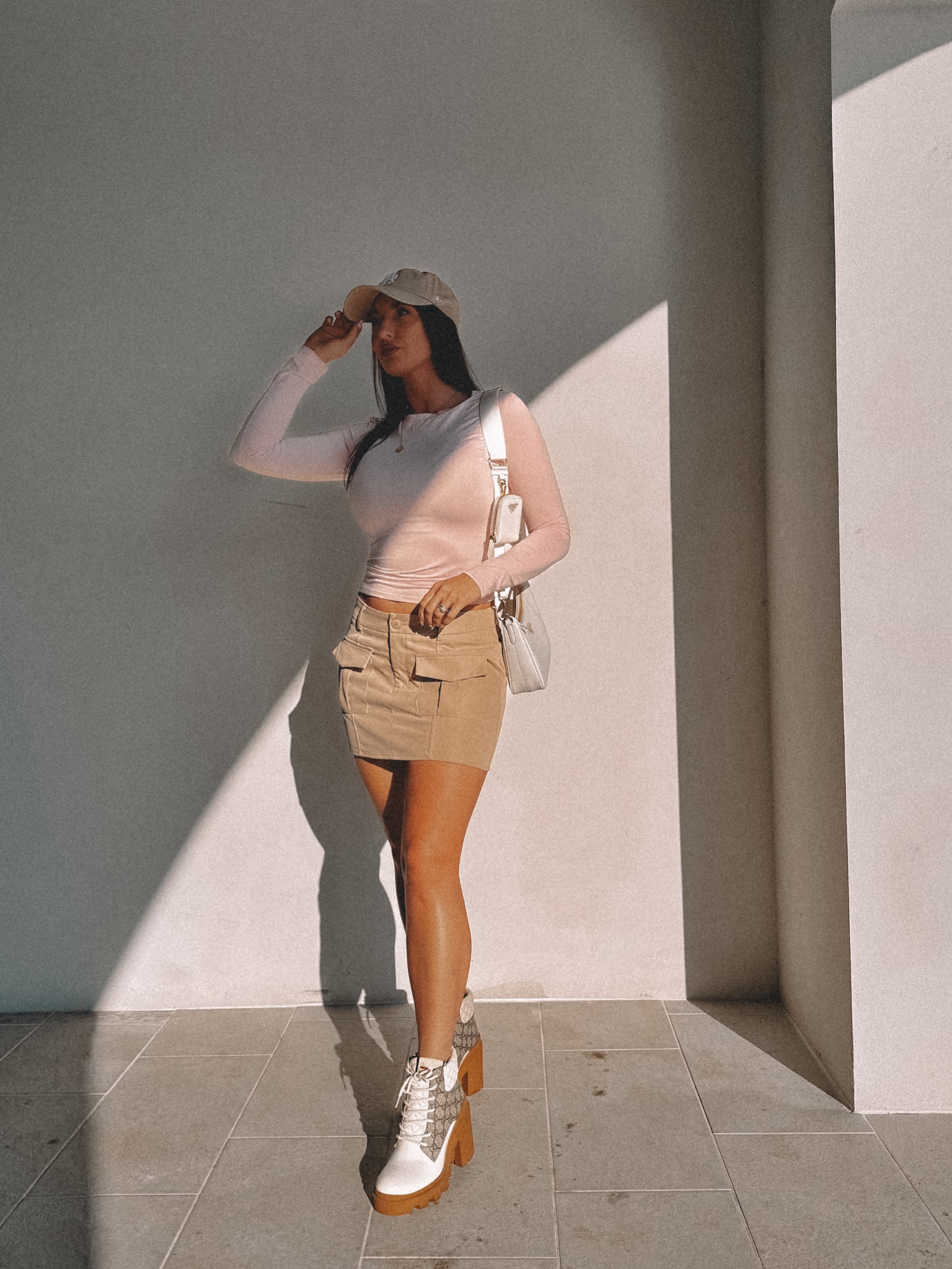The outfit is a chic blend of outdoor casual with a trendy touch, combining comfort and style with its practical footwear, fitted neutral-toned garments, and a smart layering piece that adds a sophisticated edge to the ensemble. The small backpack accessorizes functionally while contributing to the overall contemporary aesthetic suitable for an adventure in nature.