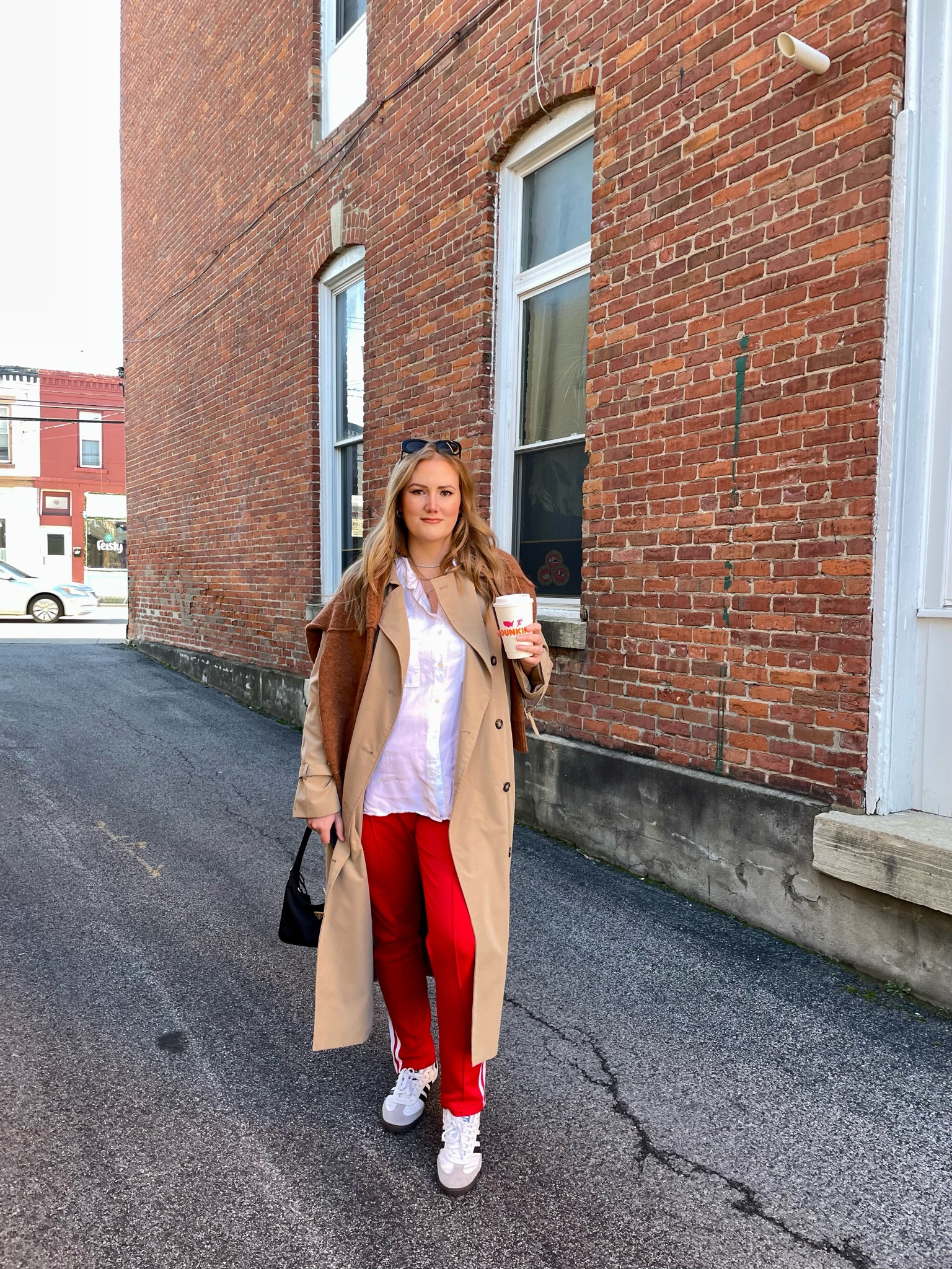 This ensemble expertly balances bold and neutral tones, with the vibrant red pants providing a pop of color against the classic beige trench coat. The relaxed white top and stylish sneakers add a casual yet chic touch, making the outfit versatile for various occasions.