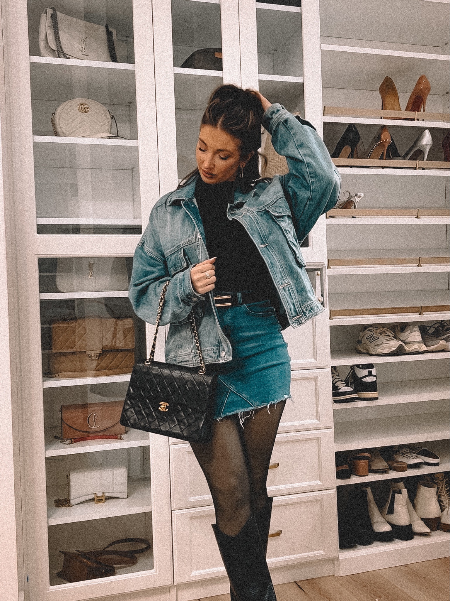 This outfit showcases a chic urban style with a well-balanced play of textures and layers; the classic denim-on-denim combination is refreshed with a modern twist through the distressed skirt and the oversized jacket, while the black elements provide a sleek contrast that’s effortlessly elevated by the elegant handbag.