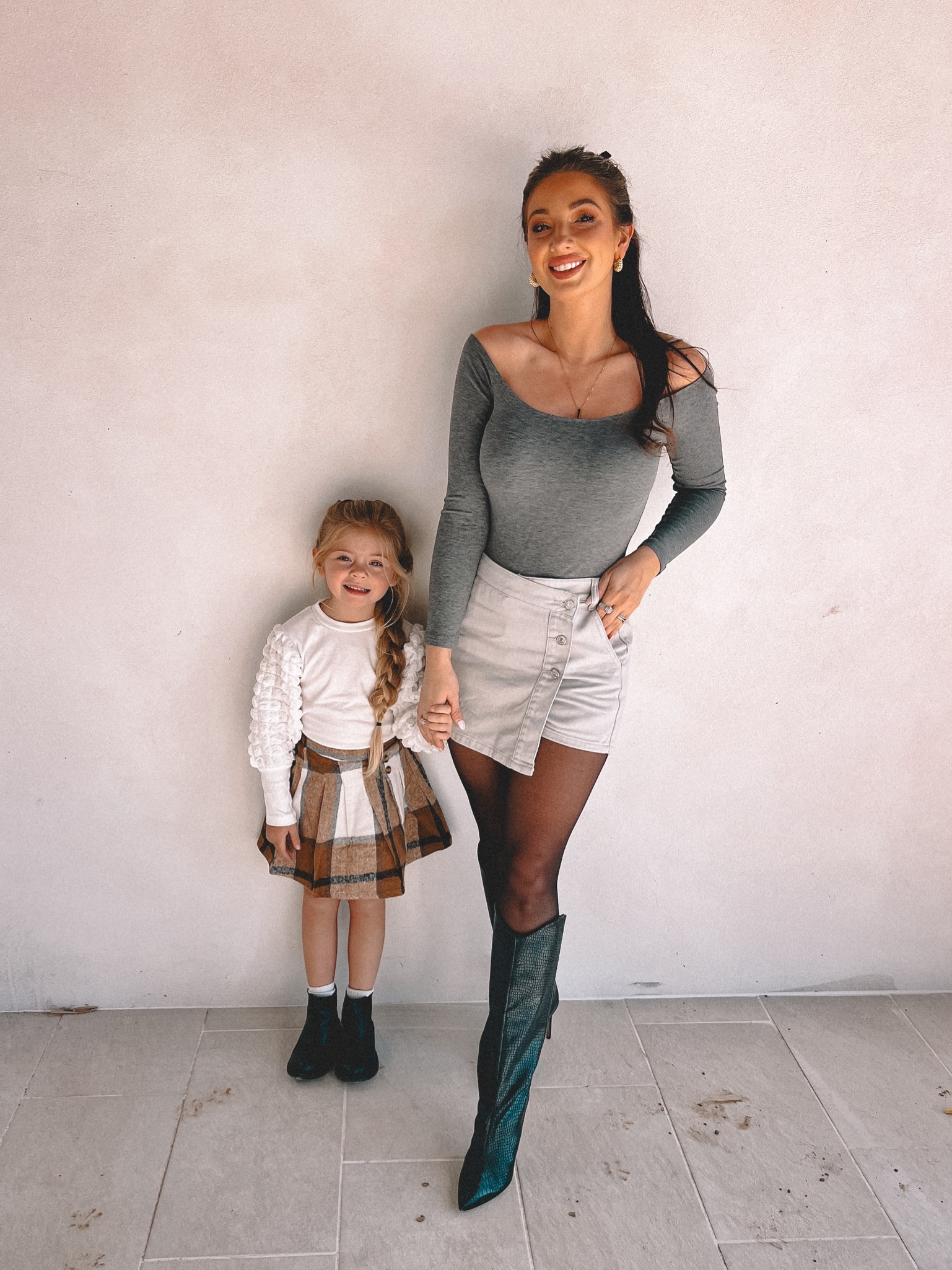 The outfit exudes a chic and elegant vibe with its coordinated monochrome palette, while the thigh-high boots add a stylish edge, complementing the simplicity of the ensemble with a touch of sophistication. The textured layer adds visual interest and warmth, perfect for a polished autumn look.