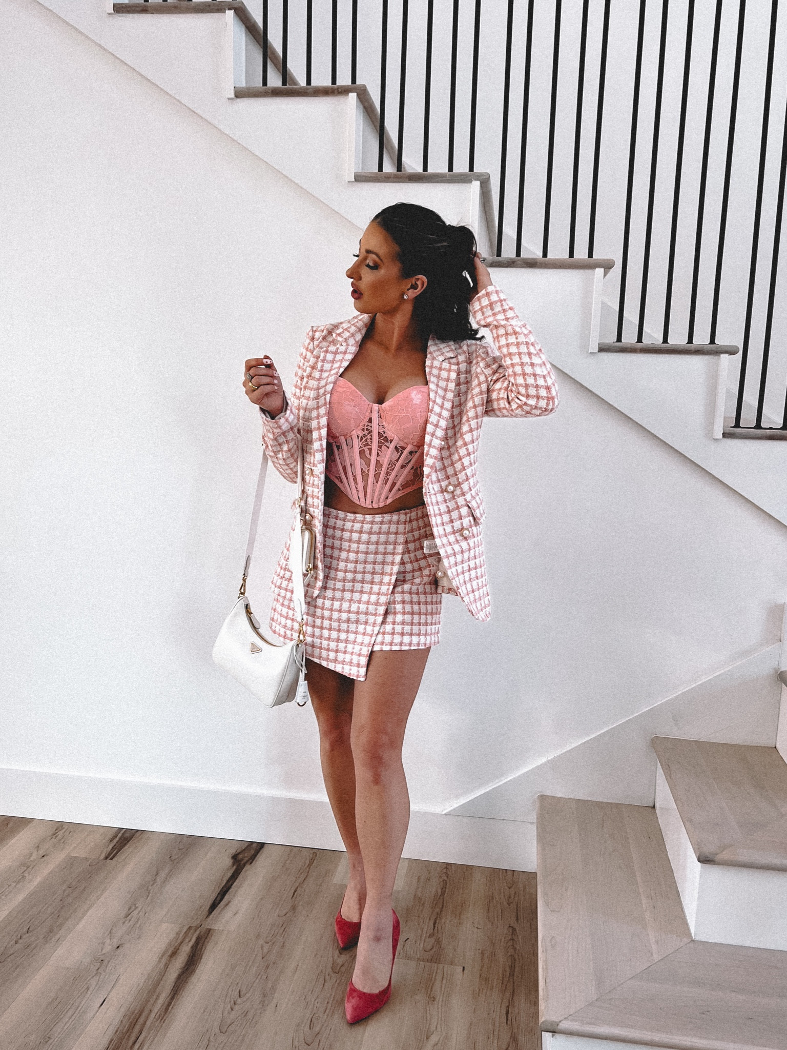 The outfit showcases a chic and cohesive blend of patterns and color, with the plaid blazer and skirt set offering a sophisticated yet playful vibe, complemented by pops of pink that add a lively, feminine touch. Accessories like the pointed red heels and white handbag pull the look together, making it polished and fashion-forward.