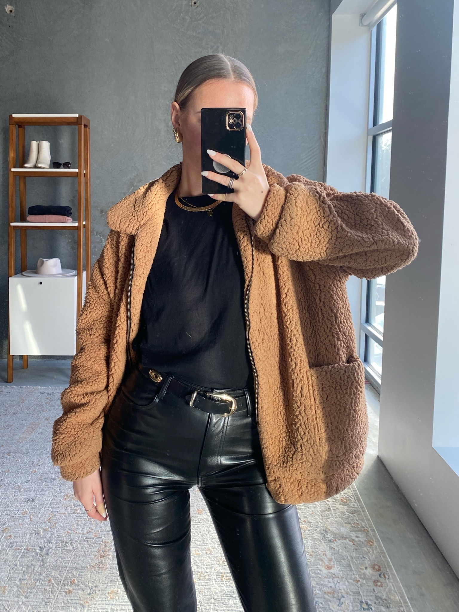This outfit effectively balances comfort and style with an oversized teddy jacket that adds texture and warmth, while the sleek leather pants provide a chic, edgy contrast. The monochromatic base of black streamlined by the fitted top and tailored pants is given a cozy yet fashionable lift by the voluminous jacket, creating a modern, urban look.