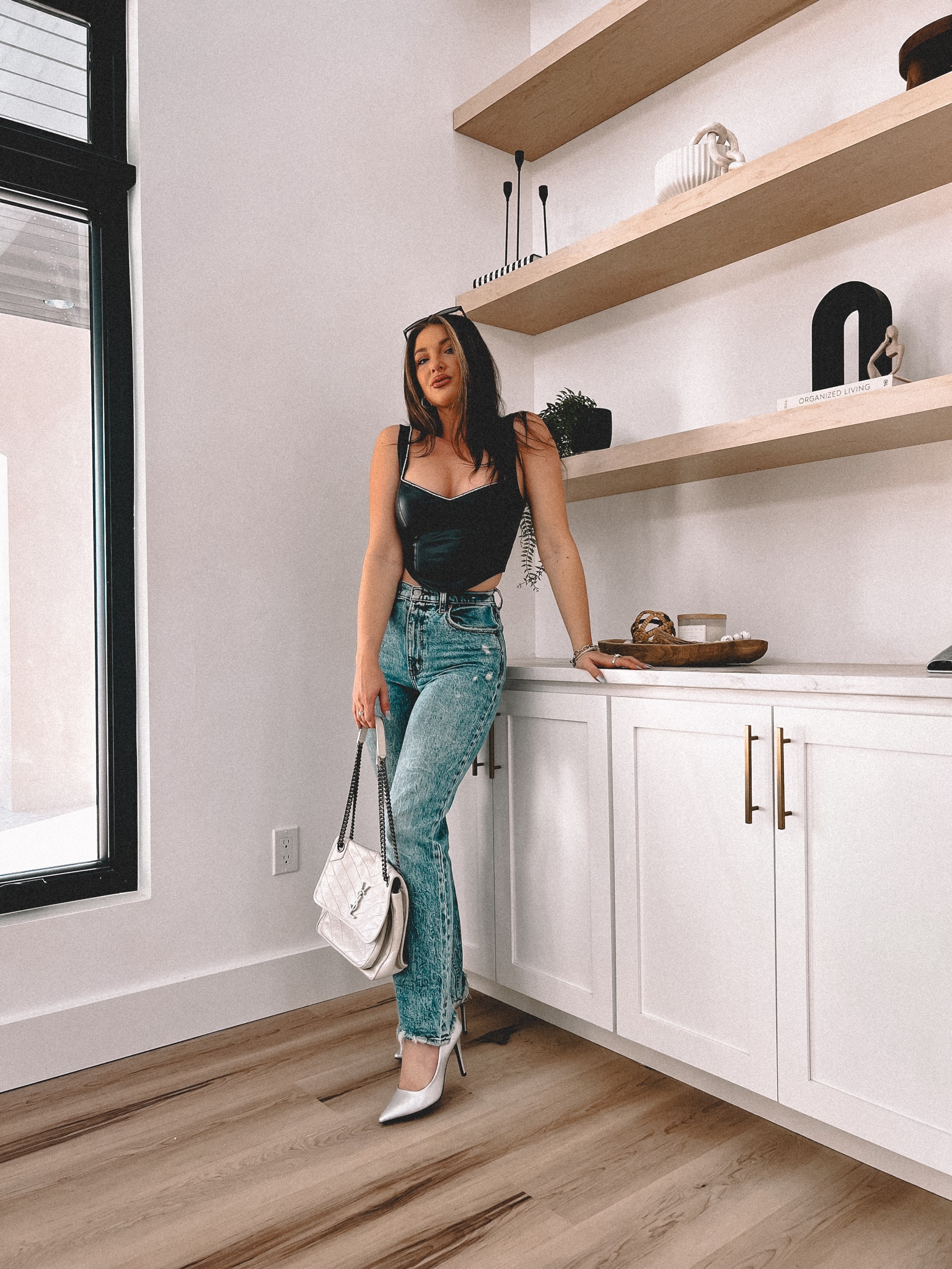 The outfit presents a chic and modern aesthetic with a well-fitted black top that accentuates the silhouette, and the high-waisted jeans add a trendy vintage flair. The ensemble is completed with stylish white heels and a coordinating white bag, offering a balanced and polished look.