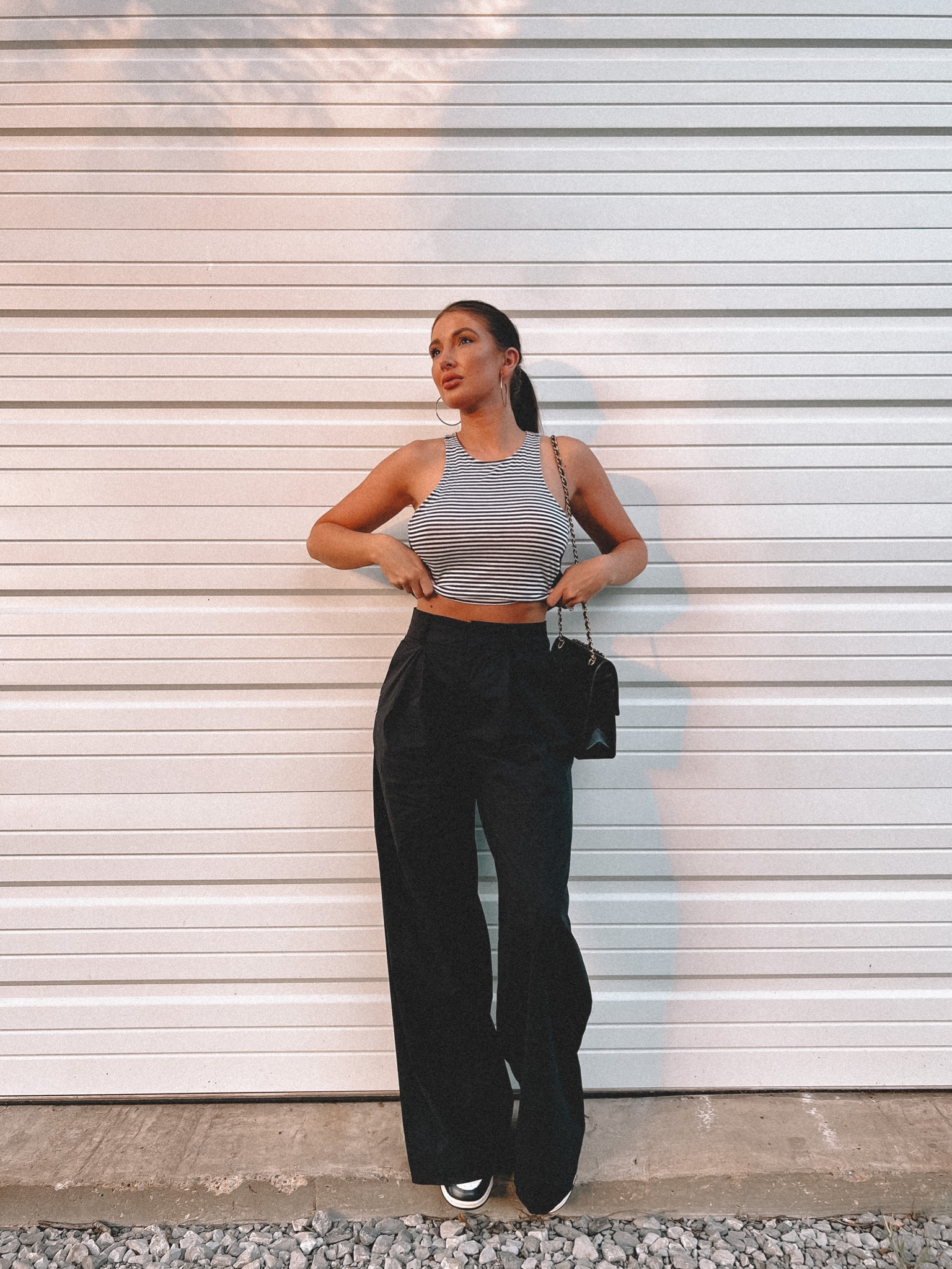 The outfit presents a chic and modern aesthetic with its high-waisted black trousers that elongate the silhouette, paired with a striped crop top that adds a casual yet trendy vibe. The monochrome color palette is timeless and versatile, perfect for various occasions.