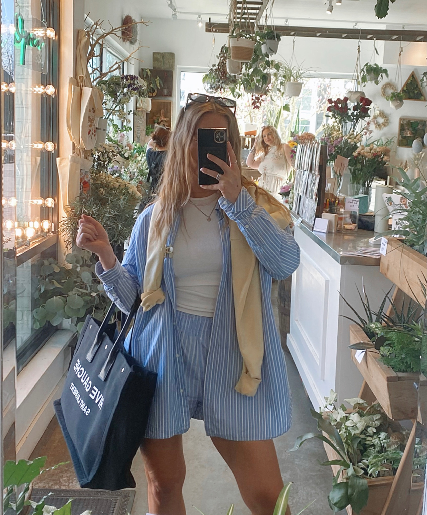 The outfit showcases a relaxed yet stylish aesthetic, with the coordinated blue striped shorts and shirt offering a refreshing, nautical vibe perfect for a casual outing. The added layer of a light cream jacket provides a nice contrast and additional warmth, while accessories like the sunglasses and tote bag enhance functionality and fashion-forward appeal.