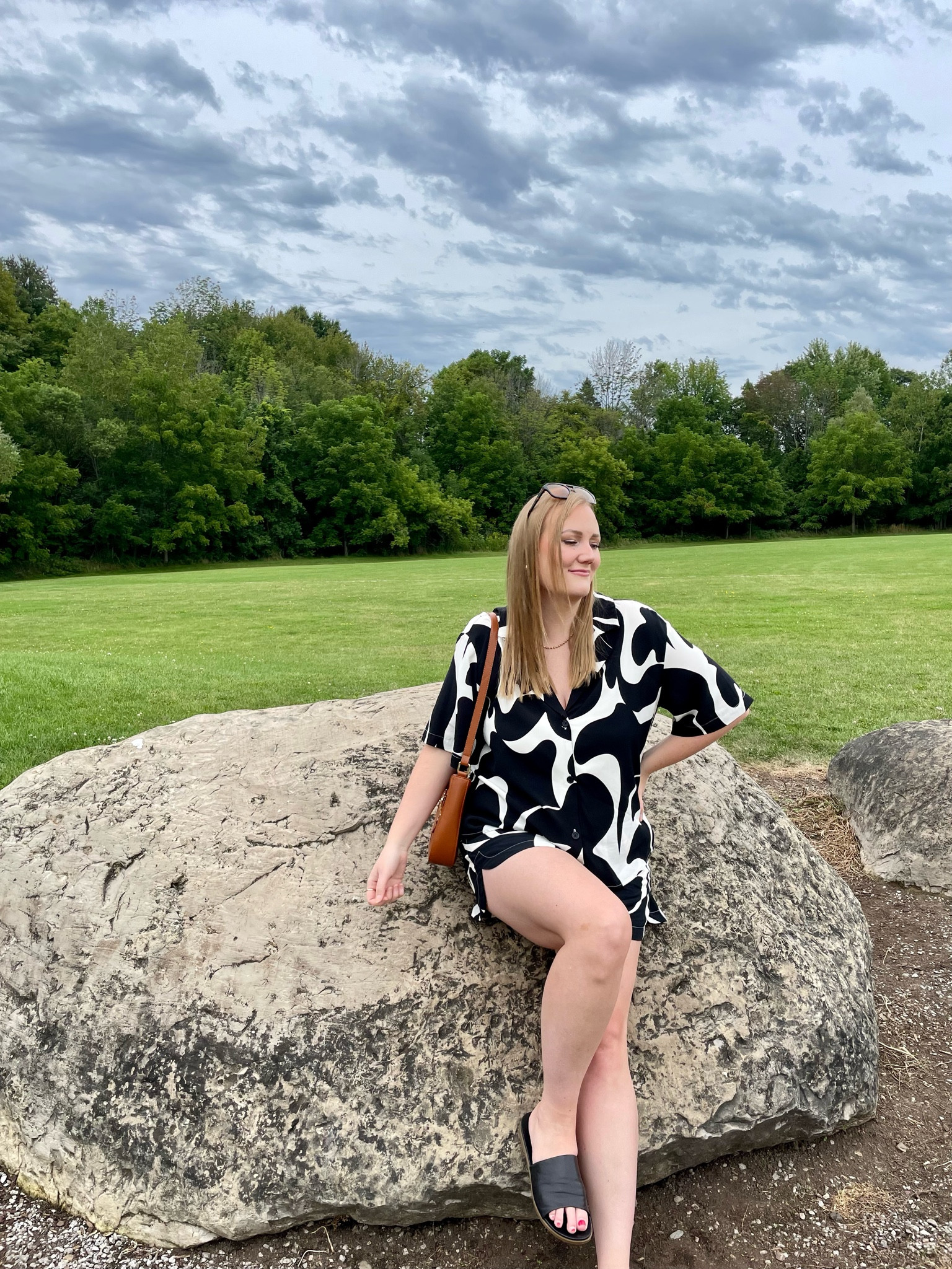 The outfit features a bold black and white print which makes a strong fashion statement with its eye-catching contrast. The relaxed fit of the dress paired with simple accessories and casual slides offers a chic yet comfortable look that’s ideal for a day out.