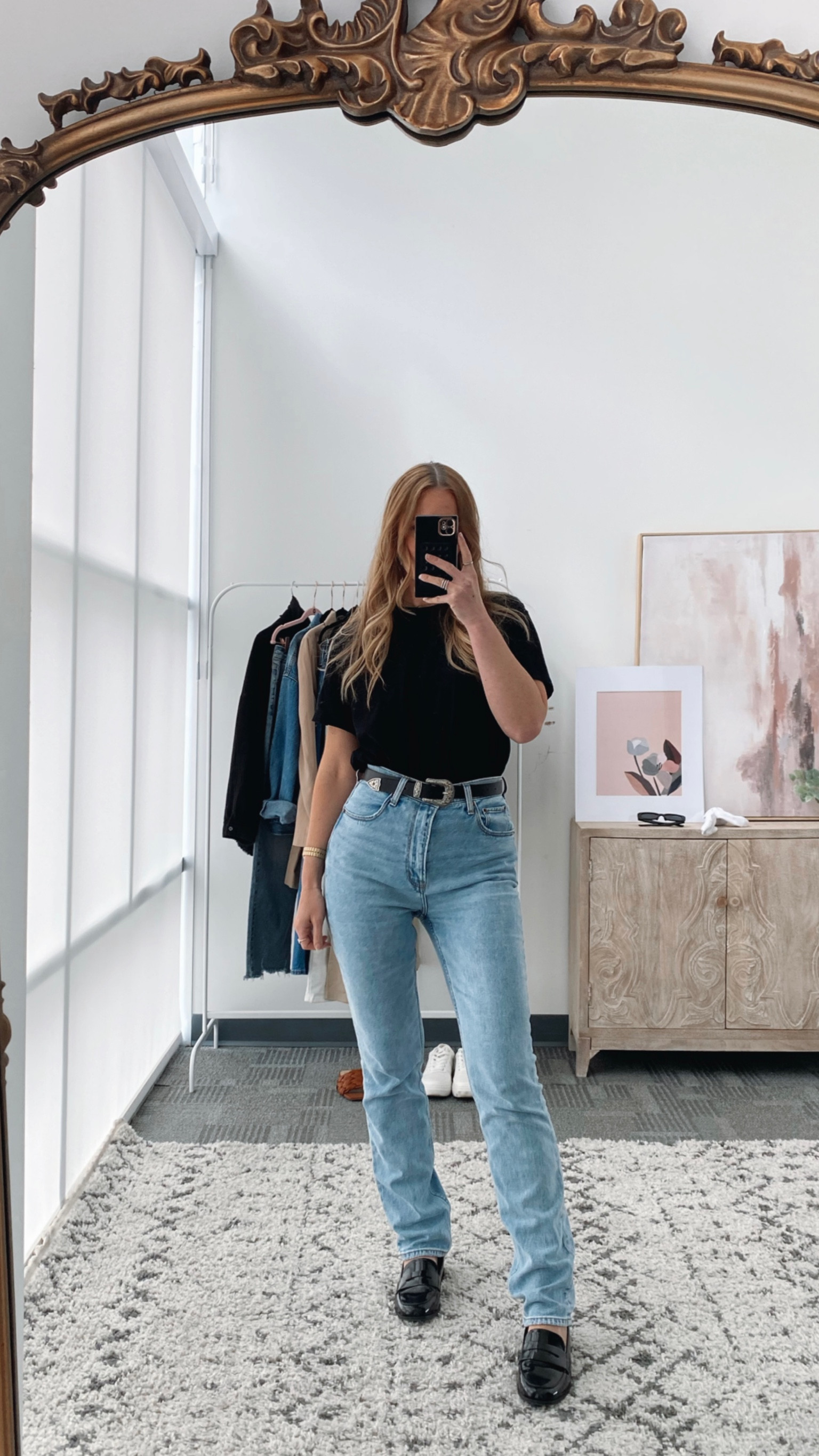 This outfit is a stylish example of classic simplicity, pairing a timeless black top with high-waisted blue jeans for an effortlessly chic look. The addition of a subtle belt and loafers adds a polished finish, while the fit accentuates the silhouette in a flattering manner.