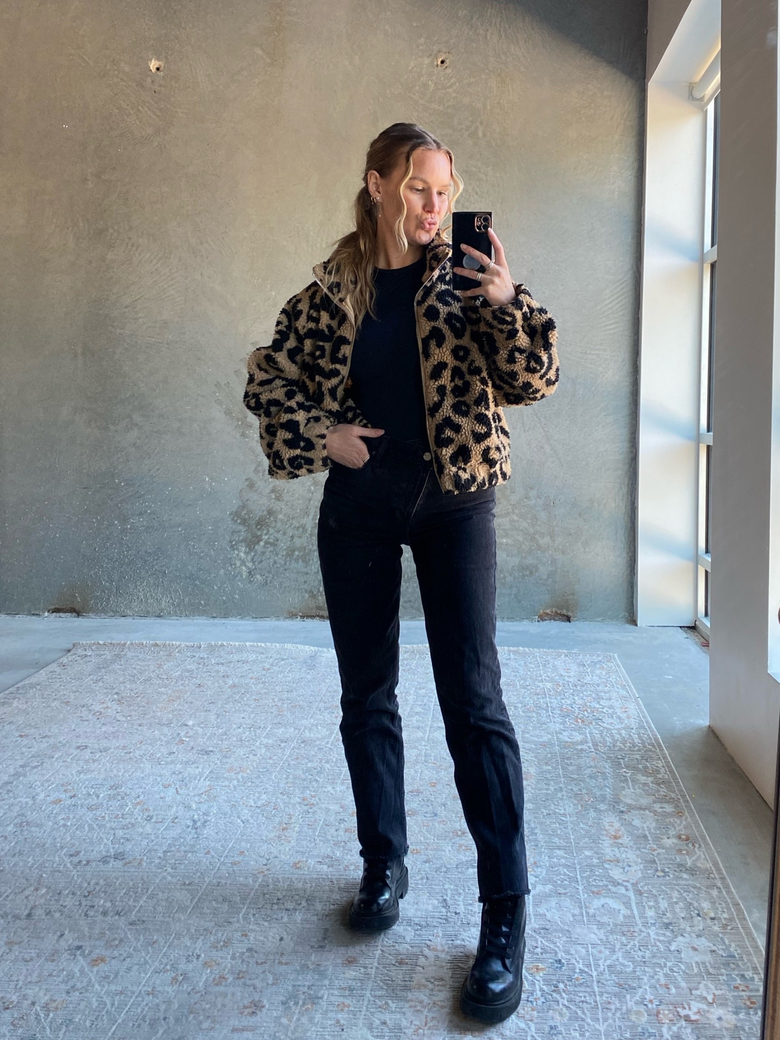 The leopard print jacket adds a bold and trendy statement to the look, while the black fitted top and jeans create a sleek and flattering silhouette, nicely paired with combat boots for an edgy finish.