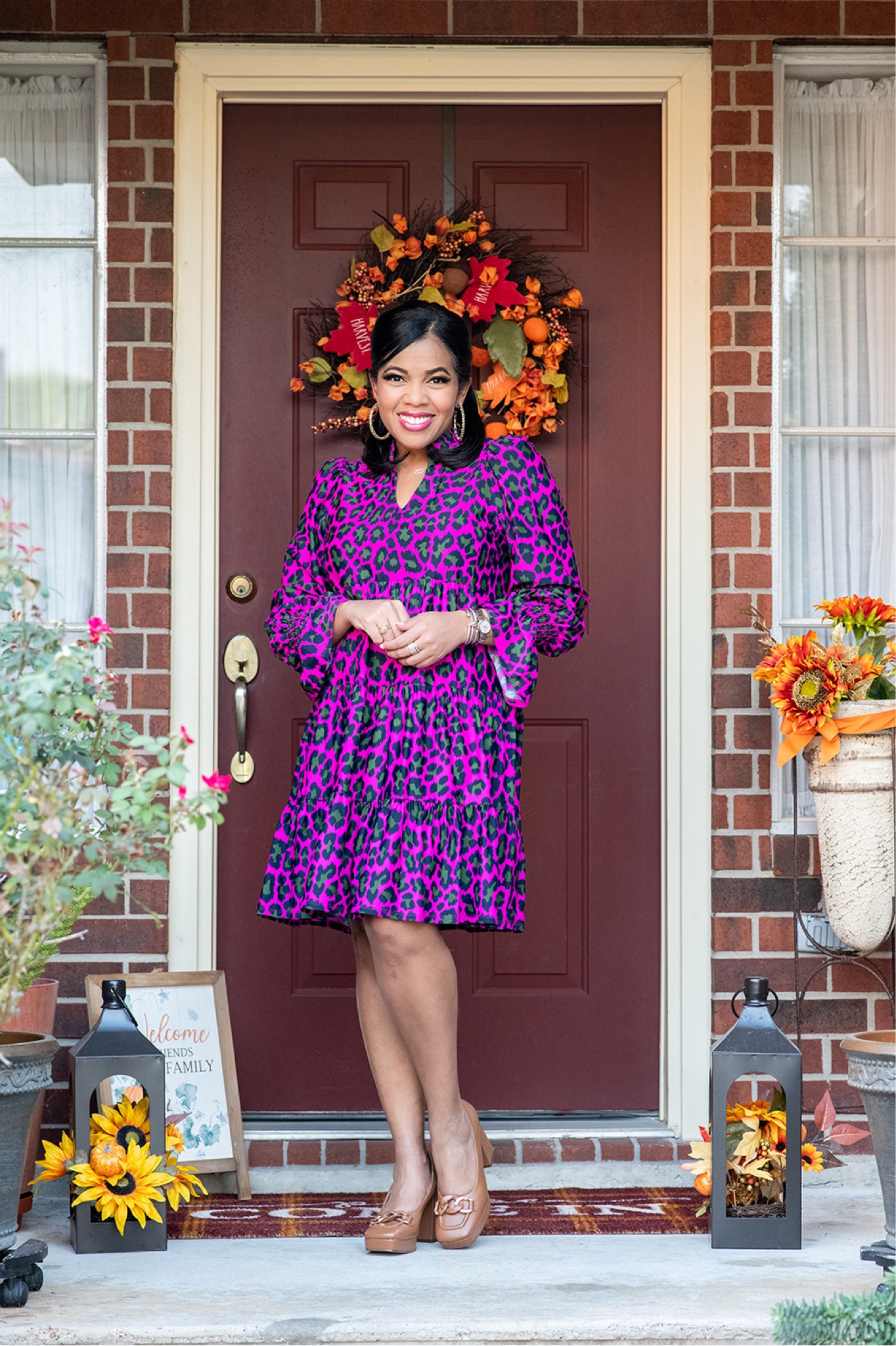 The vibrant pink and black leopard print dress exudes confidence and cheer, effortlessly commanding attention with its bold pattern and flouncy silhouette. The wearer has expertly accented it with a floral headpiece that celebrates seasonal colors, creating a harmonious balance with the autumnal doorstep decor.