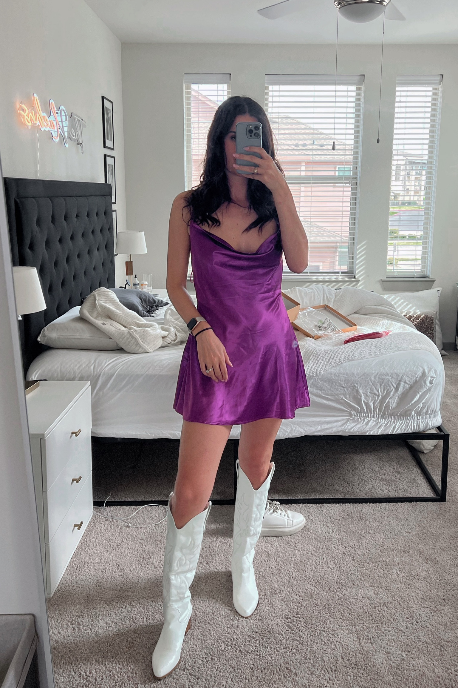The vibrant purple hue of the dress makes a bold statement, pairing perfectly with the white boots for a fresh, modern contrast. The silky texture and flattering cut of the dress add a touch of elegance and playfulness to the overall look.