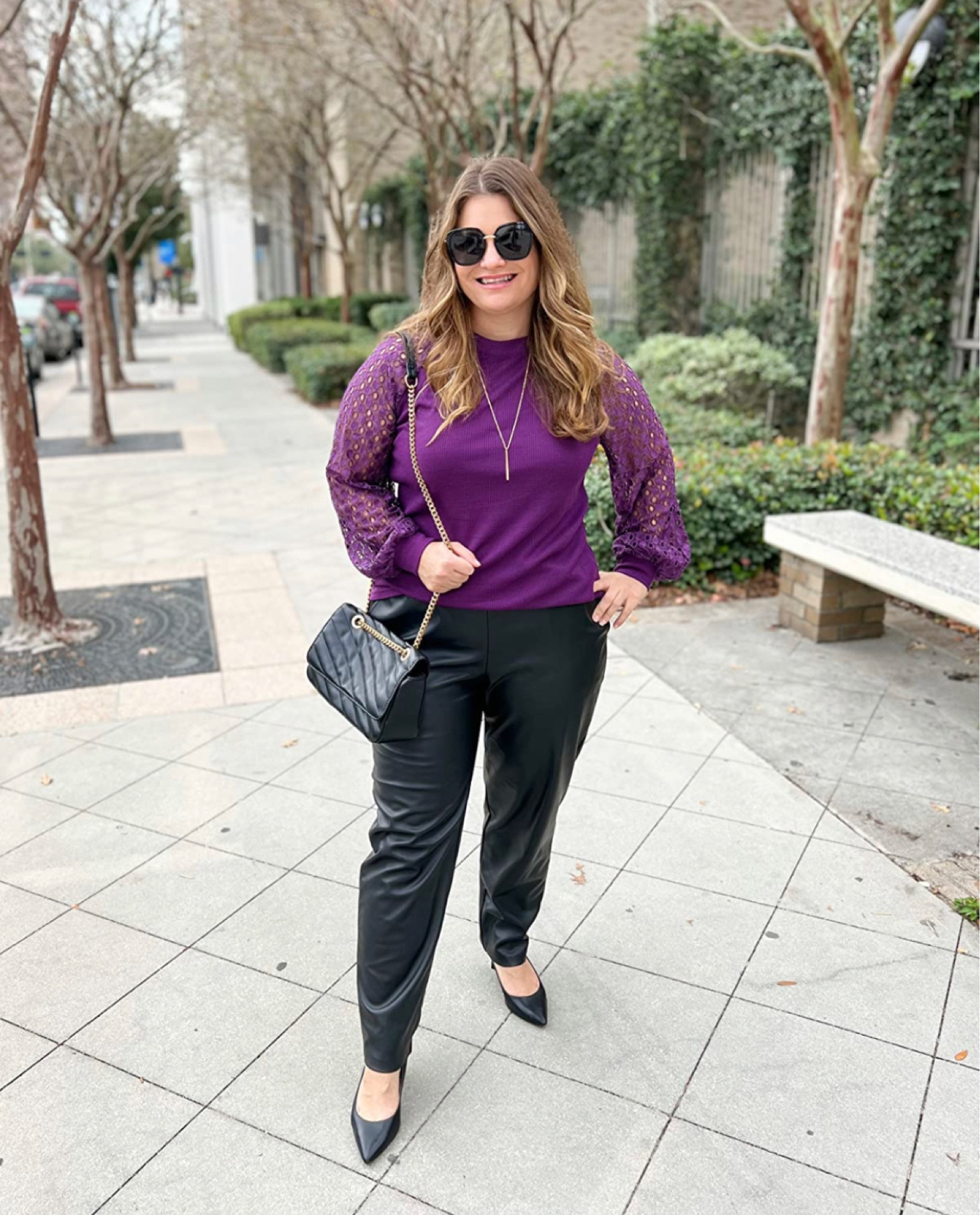 The rich purple hue of the sweater paired with the unique lacy sleeves brings a touch of elegance and a pop of color, while the black trousers and heels create a classic, streamlined look perfect for a sophisticated day out. The ensemble is well-accessorized with subtle jewelry and a chic handbag, balancing style and functionality beautifully.