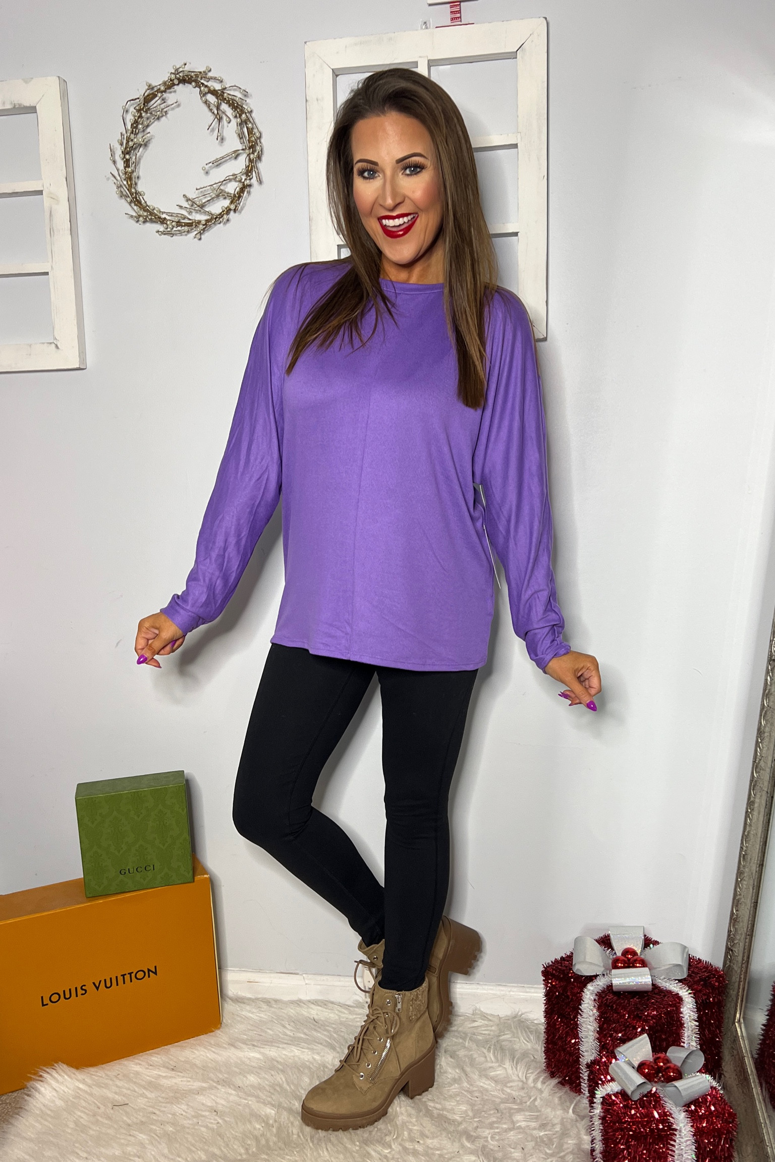 The vibrant purple hue of the top brings an energetic pop of color that is both eye-catching and flattering, while the slim-fitting black pants provide a sleek contrast that elongates the silhouette. The choice of neutral-toned boots complements the outfit perfectly, grounding the look with a touch of earthiness.