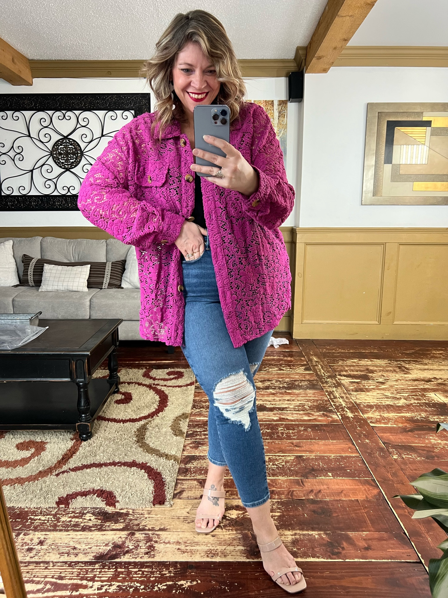 The vibrant pink jacket with its intricate pattern stands out as a bold statement piece, offering a splash of color that breathes life into the classic denim. The juxtaposition of the distressed jeans with the elegant heels adds a modern twist, striking a perfect balance between edgy and chic.