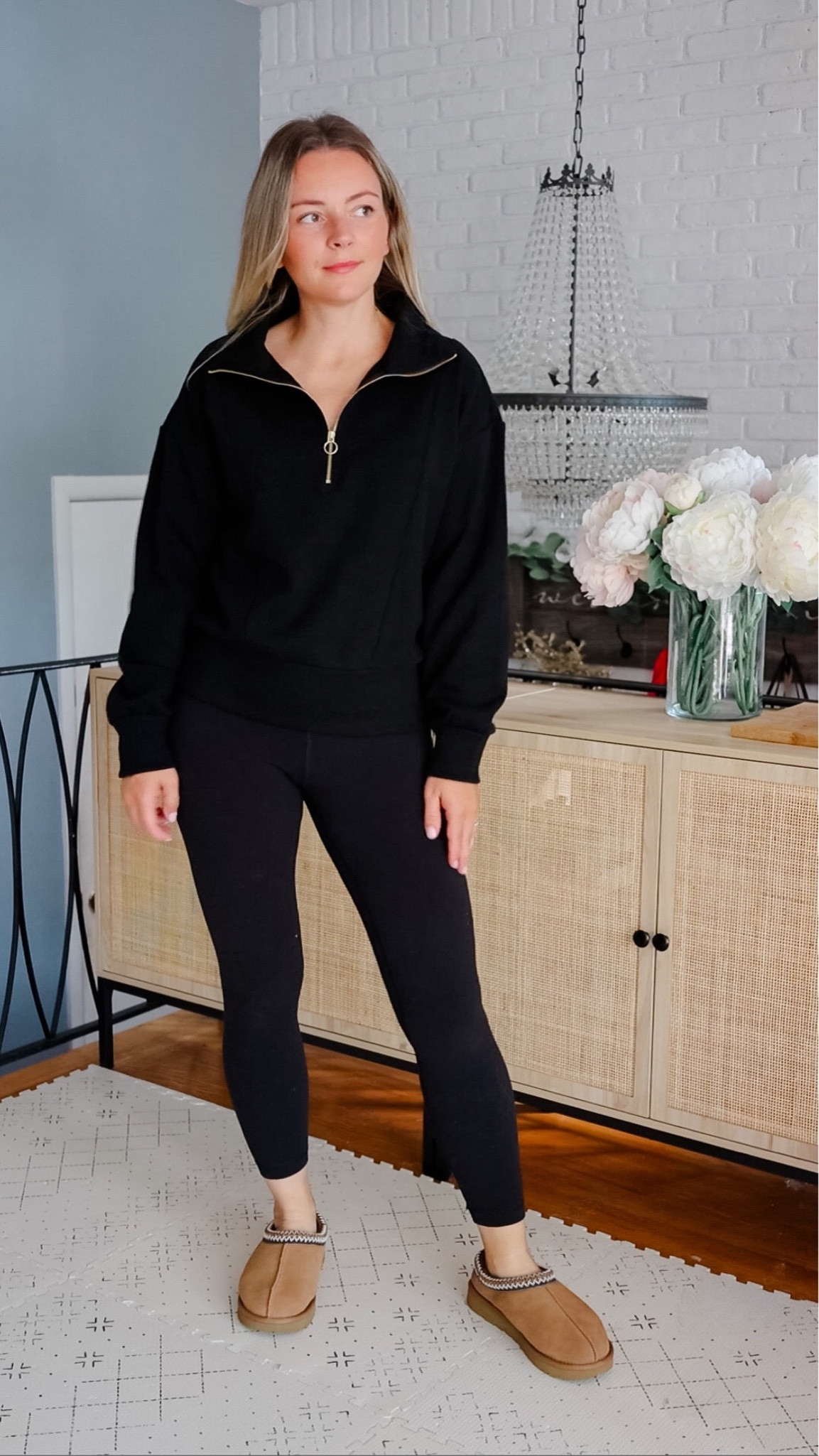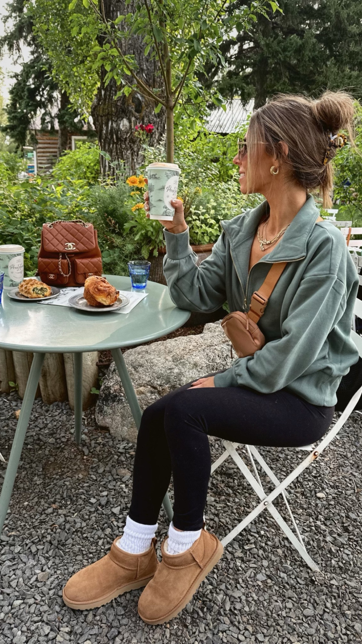 The outfit offers a seamless blend of comfort and simplicity, making it perfect for a casual yet polished look. The coordinated color palette and the relaxed fit of the sweatshirt paired with sleek leggings create a stylish, effortlessly chic ensemble ideal for everyday wear.