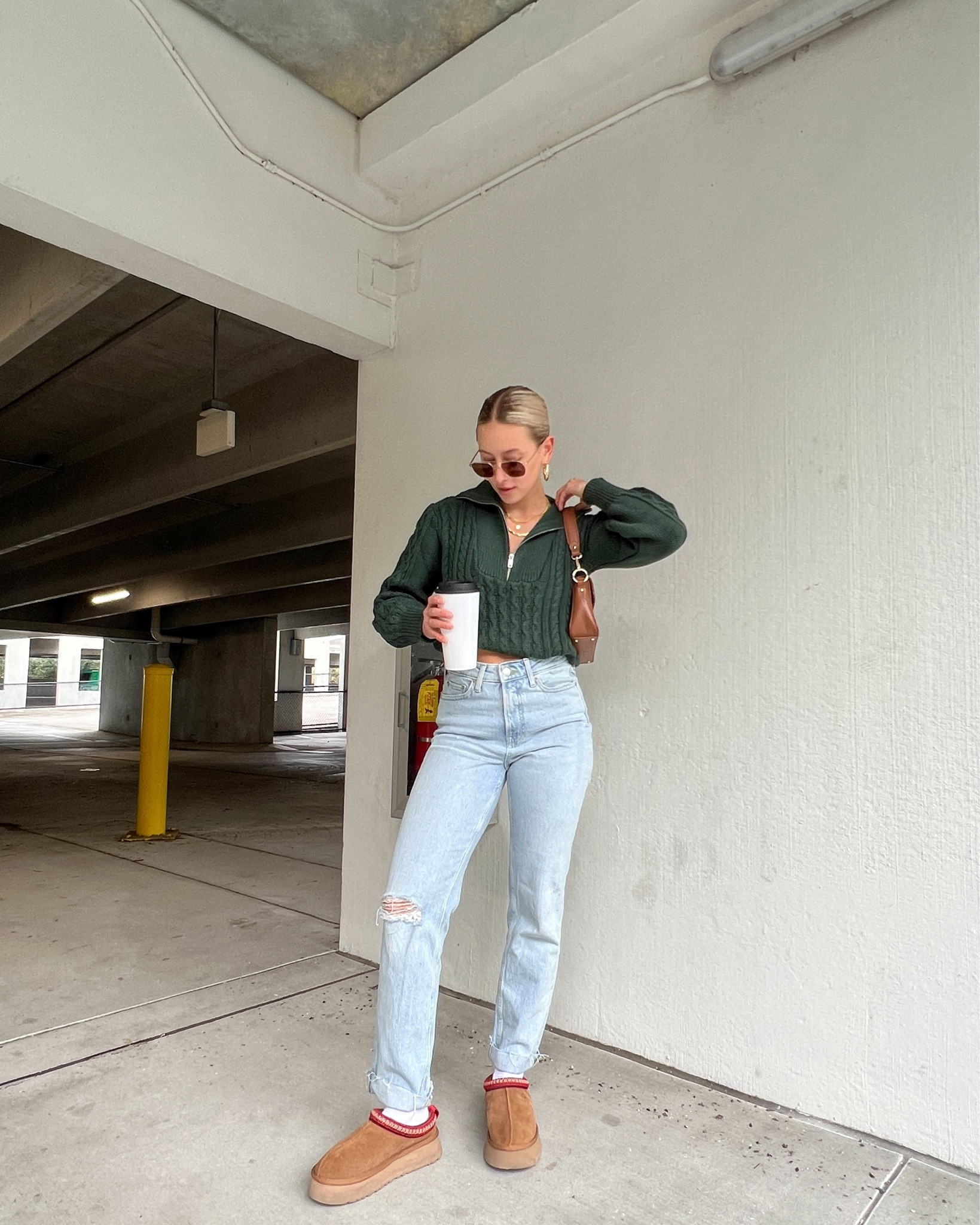 The high-waisted, distressed jeans paired with a tucked-in dark sweater create a classic silhouette with a modern twist, while the accessories – the shades and the brown bag – add a functional yet stylish finesse to the overall casual chic look. The cuffed hem showcasing the pop of red socks adds an unexpected dash of color, enhancing the fashion-forward vibe of the ensemble.