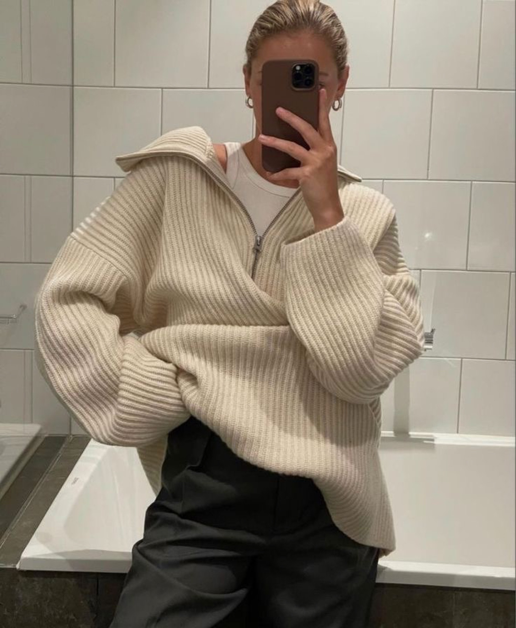 I appreciate the oversized, chunky knit sweater for its cozy yet stylish aesthetic; it pairs beautifully with the relaxed-fit trousers for a comfortable, chic look. The neutral palette offers versatility and a refined understated elegance.